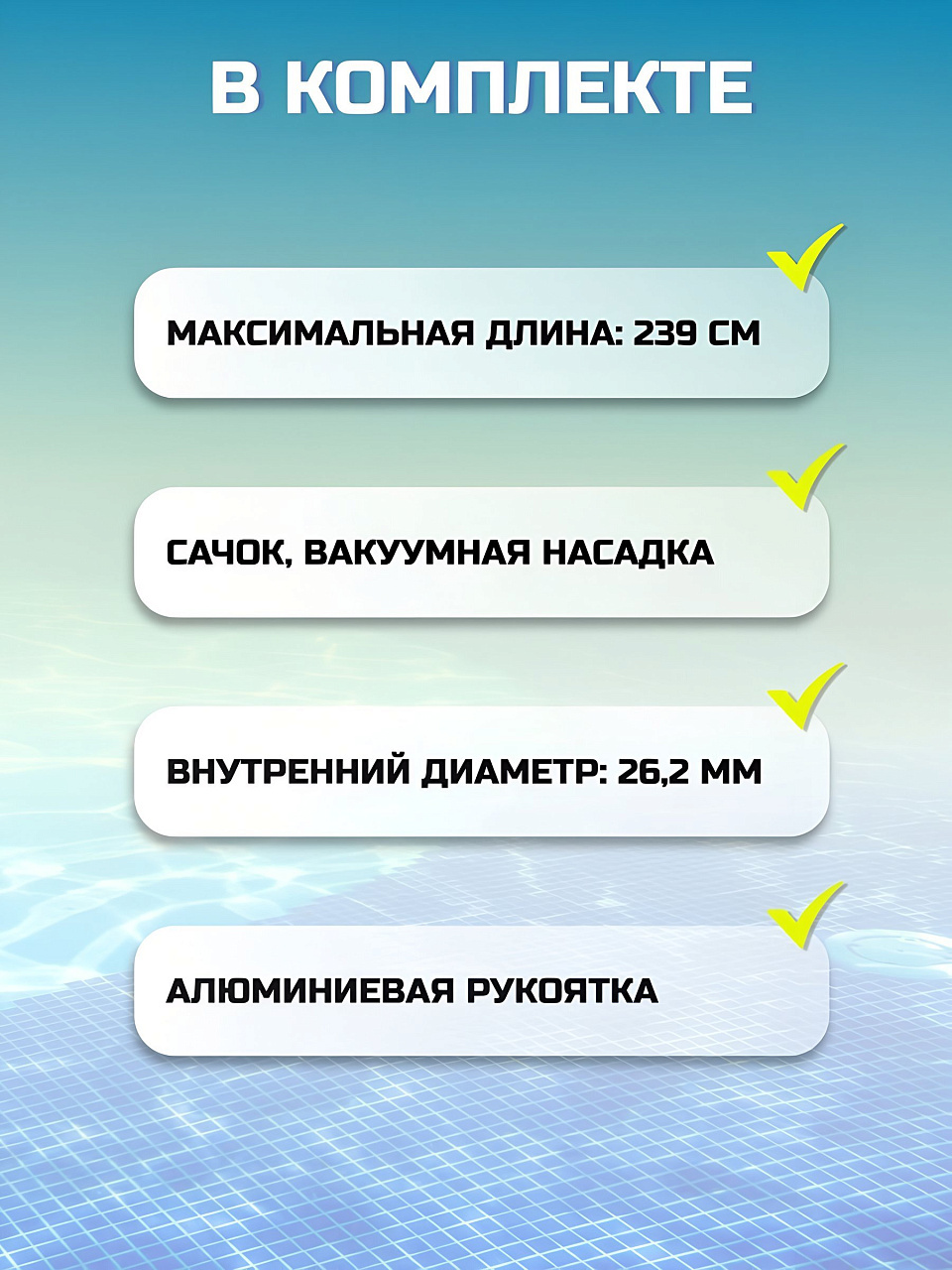 - алюминиевая телескопическая ручка длиной 239 см(для бассейна диаметром до 457 см).