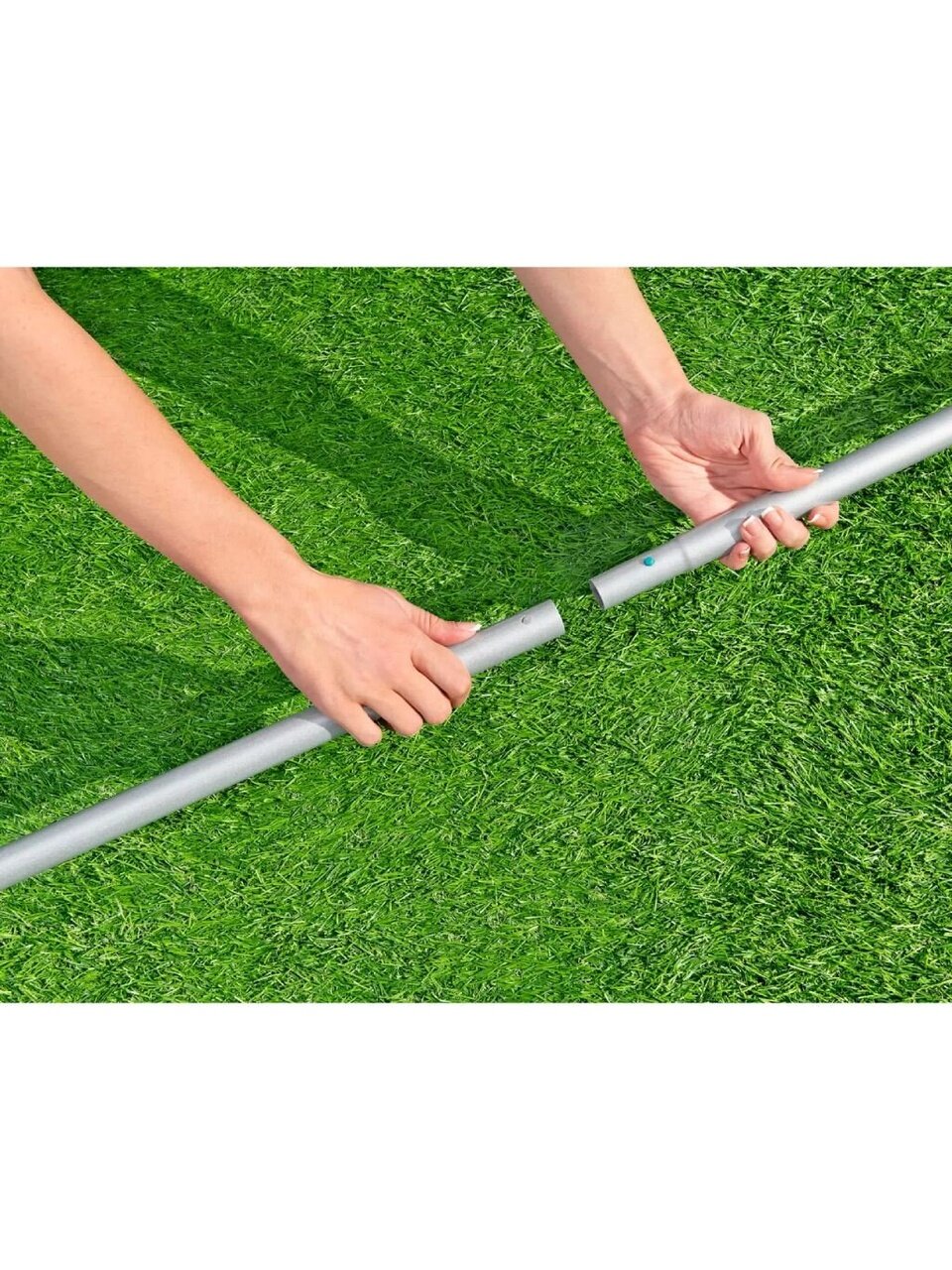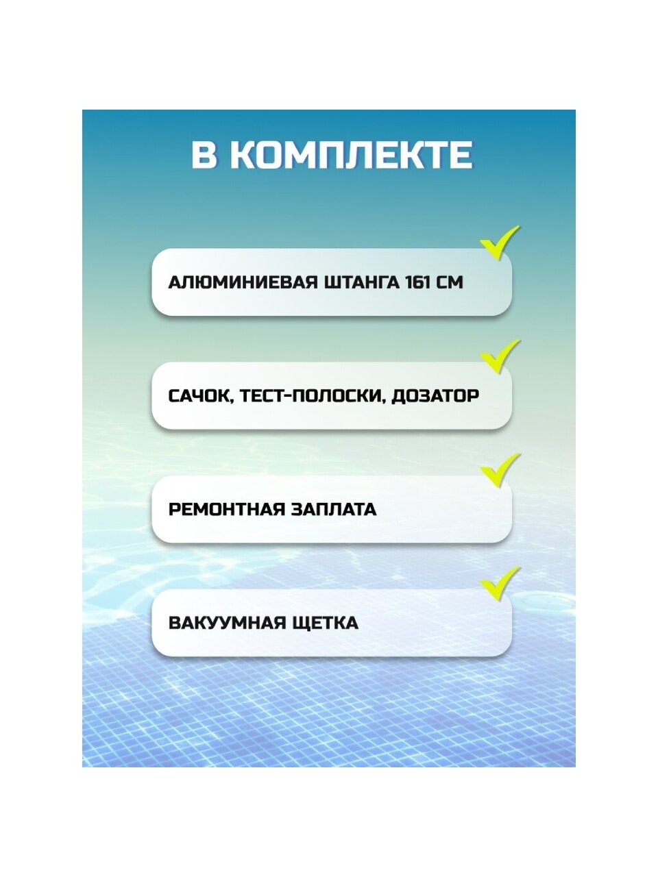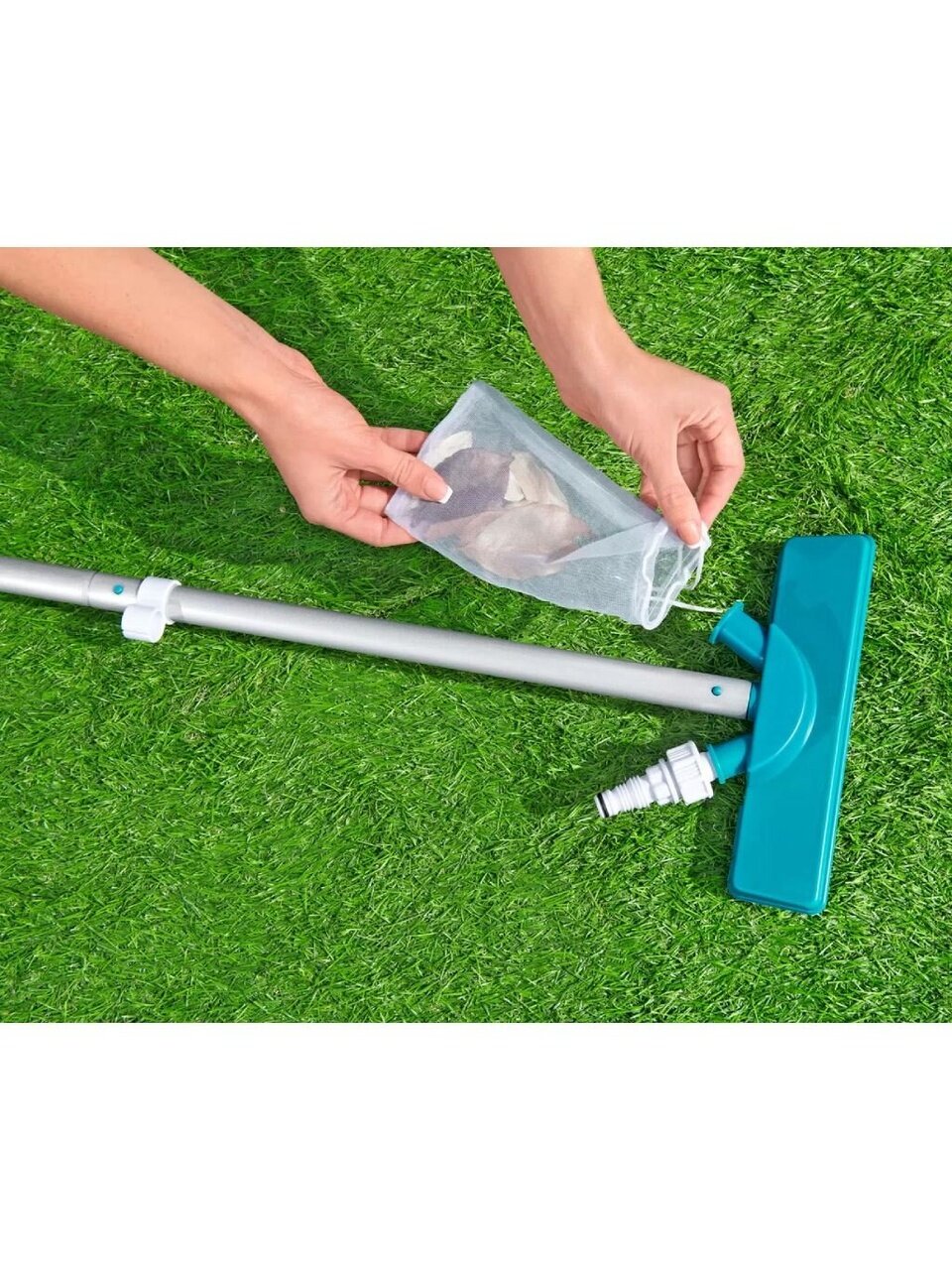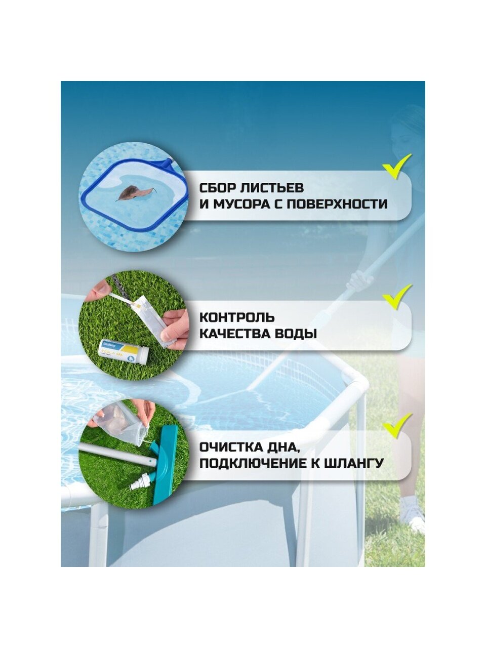 Набор включает все необходимое для комплексного ухода за бассейном: алюминиевая сборная ручка длиной 161 см позволяет легко достигать даже самых удаленных уголков бассейна, а диаметр 30 мм обеспечивает надежность и удобство в эксплуатации. Вакуумная щетка с адаптером для садового шланга и прозрачным сетчатым мешочком эффективно удаляет мусор, обеспечивая чистоту дна бассейна. Сачок помогает улавливать крупный плавающий мусор на поверхности воды, что особенно актуально для бассейнов размером до 396 см.