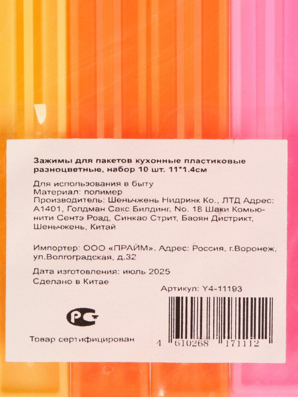 Зажимы для пакетов кухонные, 11х1.4 см, 10 шт, пластик, разноцвет, Y4-11193