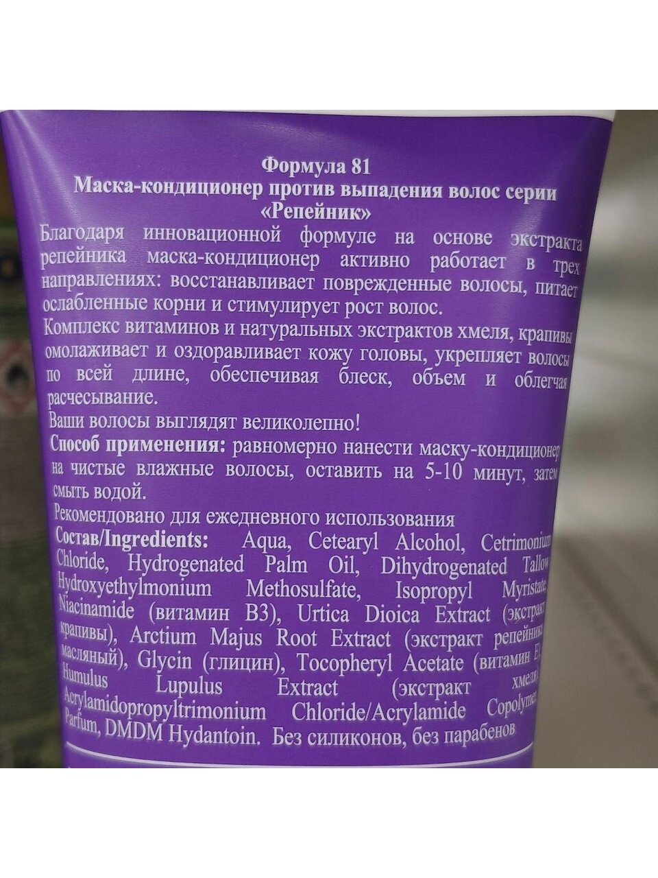 Благодаря формуле «Три актив» состоящей из масла репейника, экстракта корня лопуха и шишек хмеля, маска-кондиционер активно работает в трех направлениях. Восстанавливает поврежденные волосы, питает ослабленные корни и стимулирует рост волос. Специальные кондиционирующие компоненты обеспечивают блеск, яркость цвета, объем и легкость при расчесывании волос. Применяйте маску-кондиционер вместе с другими средствами серии «Репейник» и Вы быстро получите ожидаемый результат.