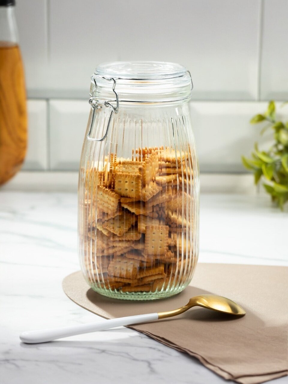 Откройте для себя стиль и функциональность с банкой для сыпучих продуктов объемом 1.5 л. Изготовленная из качественного стекла, она не только украсит кухню, но и обеспечит надежное хранение благодаря бугельному замку. Модель "Страйп" идеально подходит для хранения круп, сахара, муки и других сыпучих продуктов.