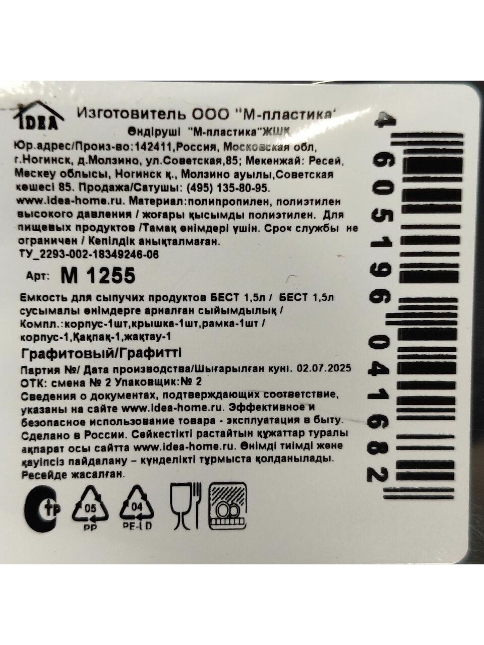 Вы можете приобрести «Банка для сыпучих продуктов, пластик, 1.5 л, 19.6 см, с крышкой, Idea, Бест, М 1255» и другие товары в нашем интернет-магазине в Липецке по низким ценам и с бесплатным самовывозом.