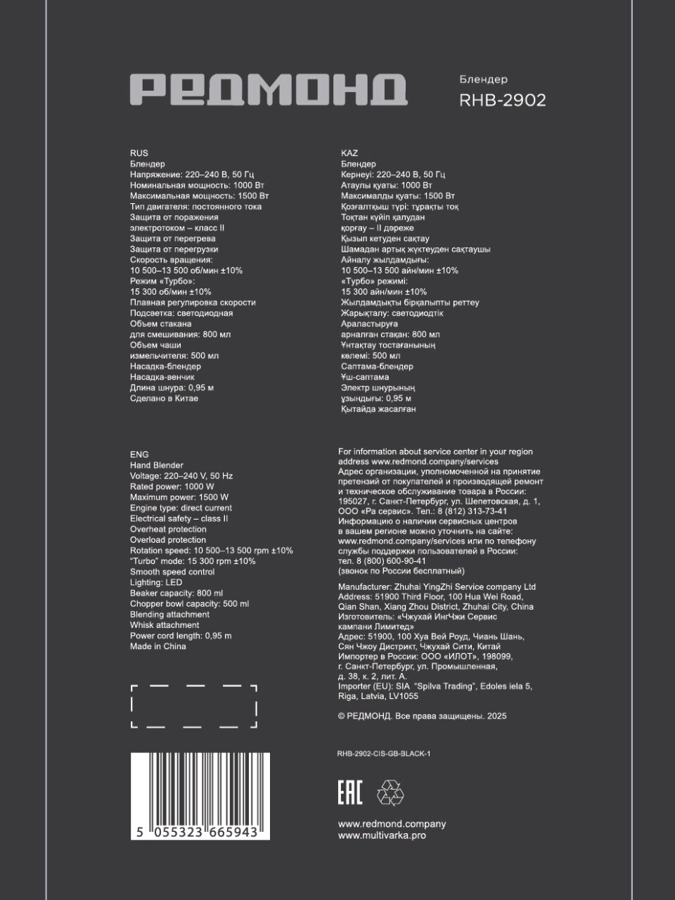 Выбирайте блендер Редмонд RHB-2902 — покупайте недорого с доставкой, получайте гарантию качества и расширенный комплект для любых рецептов. Оформите заказ сейчас и почувствуйте разницу в удобстве и скорости приготовления!