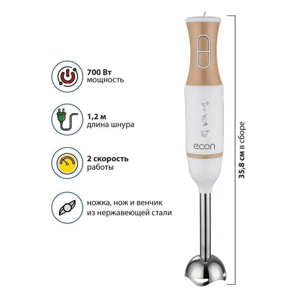 Простой и удобный погружной блендер с венчиком ECON ECO-232HB поможет измельчить продукты в любой чаше, тарелке или кастрюле, взбить или смешать продукты с помощью насадки венчика, и при этом не займет много места на вашей кухне.