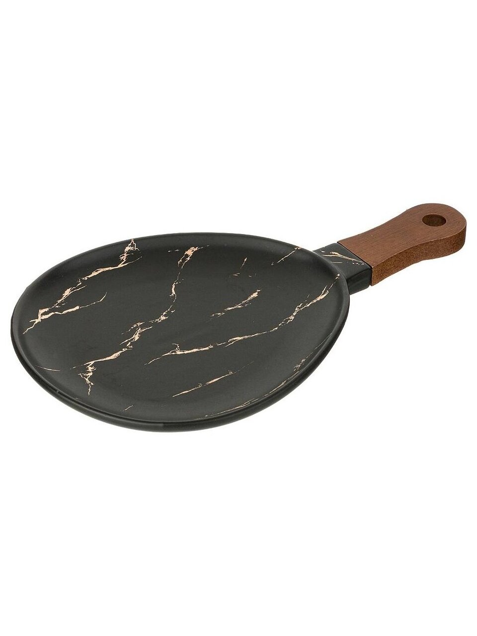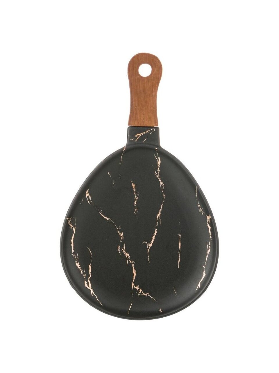 Размер — 30,7×18,4×2,4 см; материал — фарфор с декоративным мраморным рисунком и деревянной ручкой. Цвет — черный с золотым узором.