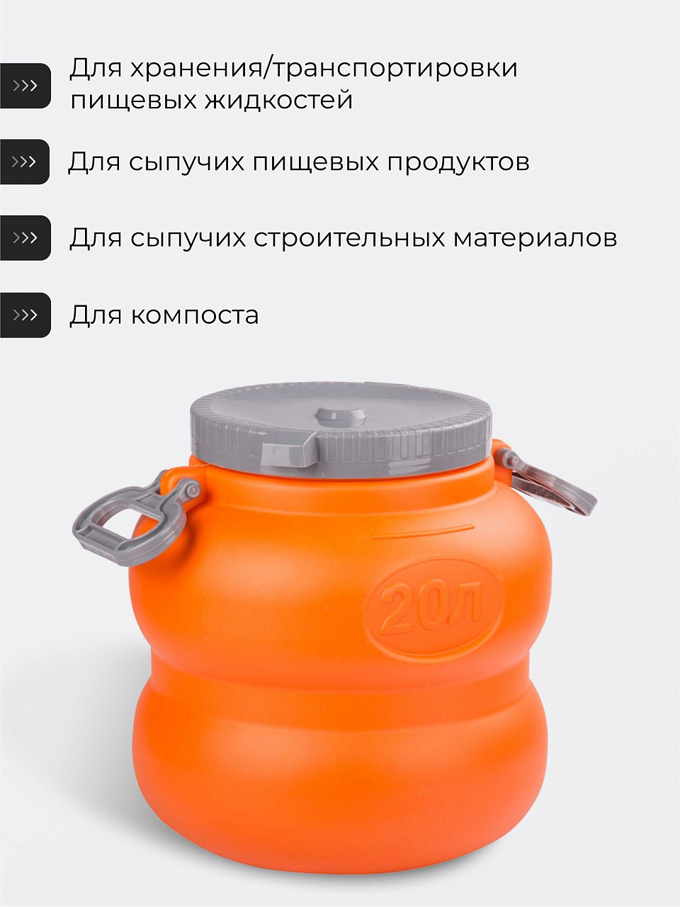 Бочка пластиковая 20 л пищевого назначения с ручками — оптимальное решение для хранения воды и продуктов на даче или дома. Удобная, прочная, оранжево-серая, модель Байкал от Альтернатива.
