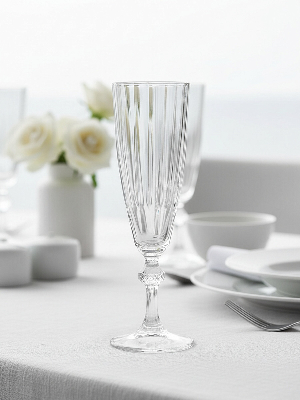 Объём составляет 170 мл, материал — прочное прессованное стекло, форма — флютте с рельефной текстурой.