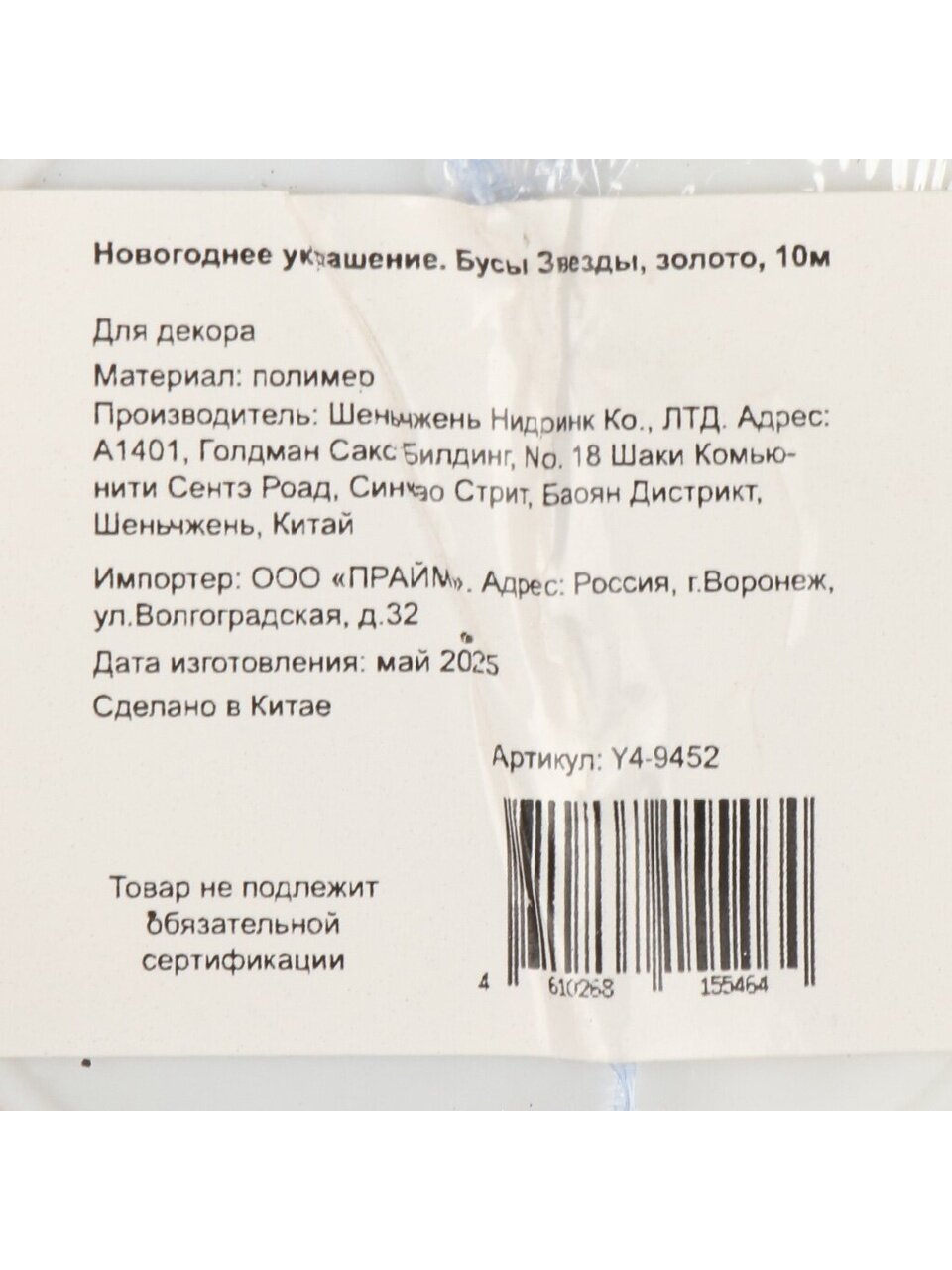 Длина — 10 м, цвет — золотой, форма элементов — звёзды, материал — полимер, страна продавца — Китай.