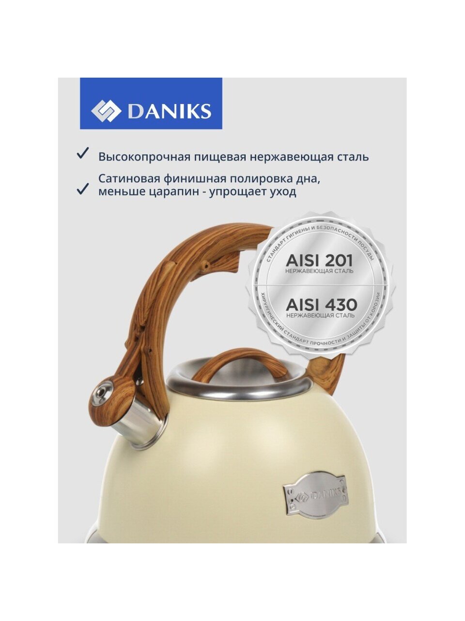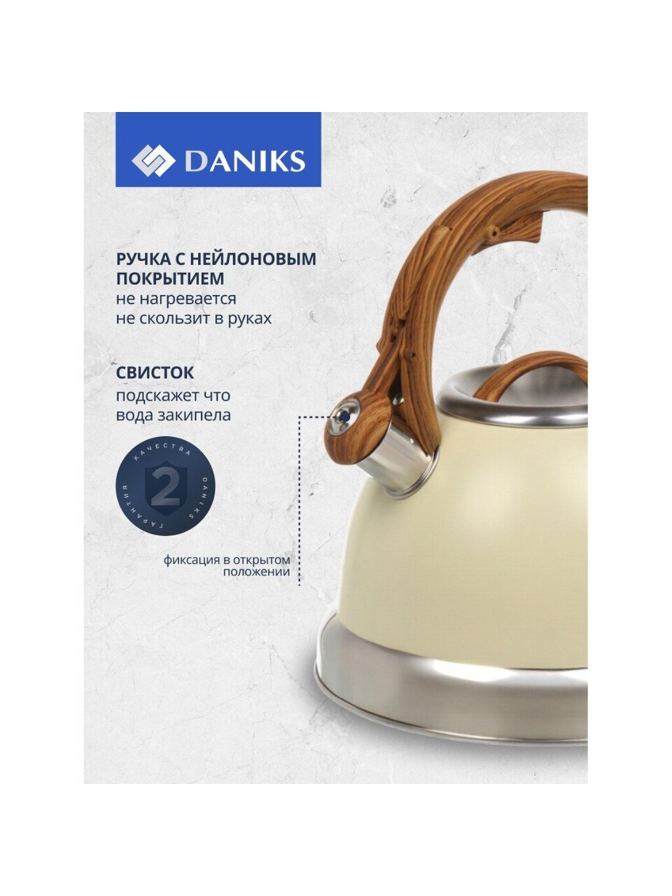 Покупая чайник Daniks, вы получаете надежный и стильный кухонный аксессуар, который прослужит долгие годы. Его вместительный объем позволяет быстро и легко приготовить горячие напитки для всей семьи или гостей. Цвет слоновая кость и матовая поверхность добавят изысканности вашей кухне, а удобная термоизолированная ручка обеспечит комфорт в использовании. Этот чайник станет незаменимым помощником в повседневной жизни, экономя ваше время и усилия.