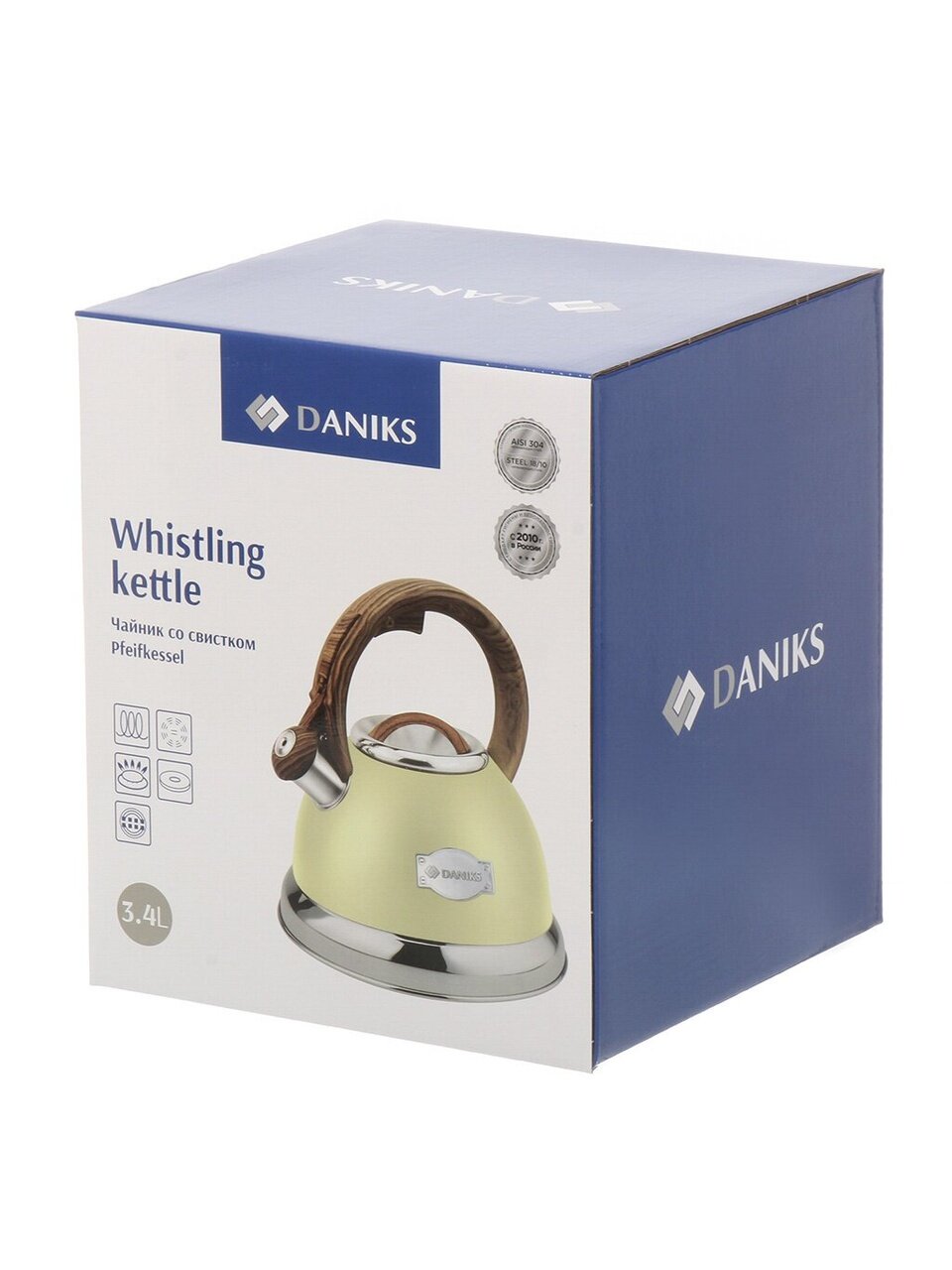 Чайник Daniks оснащен удобной нейлоновой ручкой, которая не нагревается, обеспечивая комфорт и безопасность при использовании. Кроме того, наличие свистка сигнализирует о закипании воды, что делает процесс приготовления чая или кофе еще более удобным. Этот чайник можно использовать на различных типах плит, включая индукционные, что делает его универсальным выбором для любой кухни.