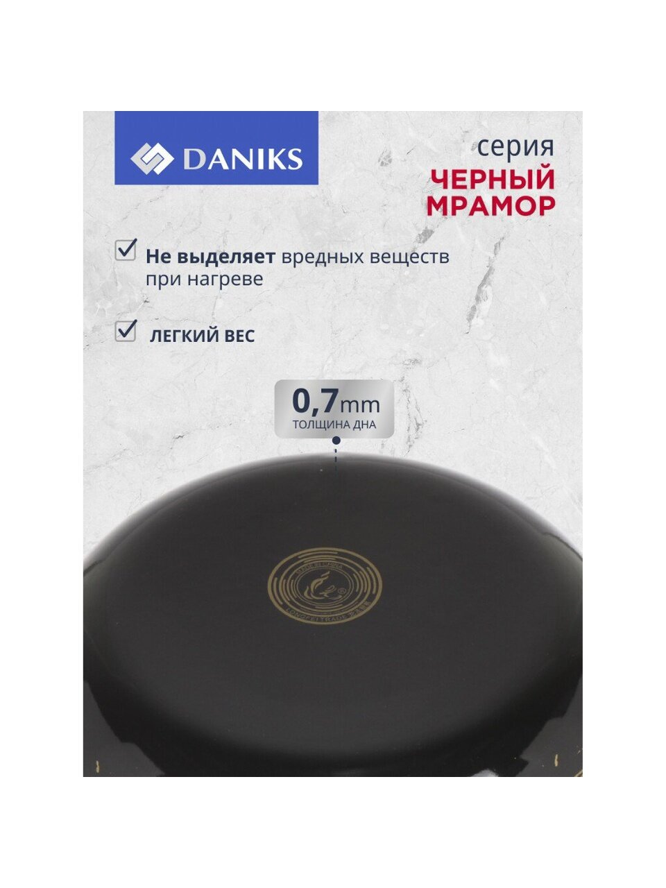 Чайник объемом 2.5 литра идеально подходит для семейных чаепитий и встреч с друзьями. Металлическая ручка обеспечивает надежный захват, а отсутствие свистка делает использование более тихим и спокойным. Модель "Черный мрамор" от Daniks разработана с учетом современных требований к кухонной технике, что позволяет использовать ее на различных типах плит, включая индукционные, газовые, галогеновые, стеклокерамические и электрические.