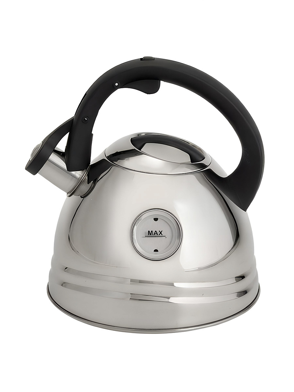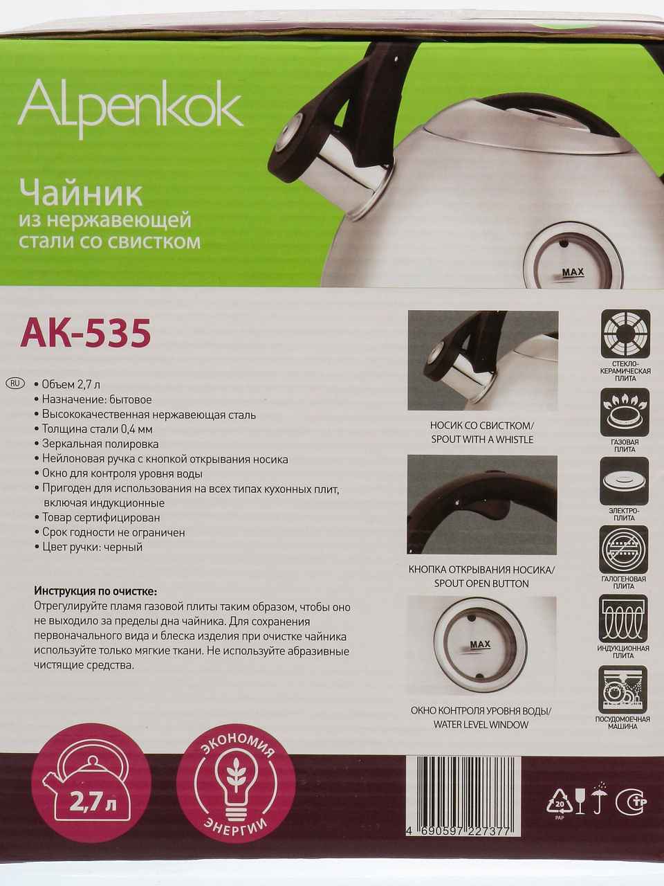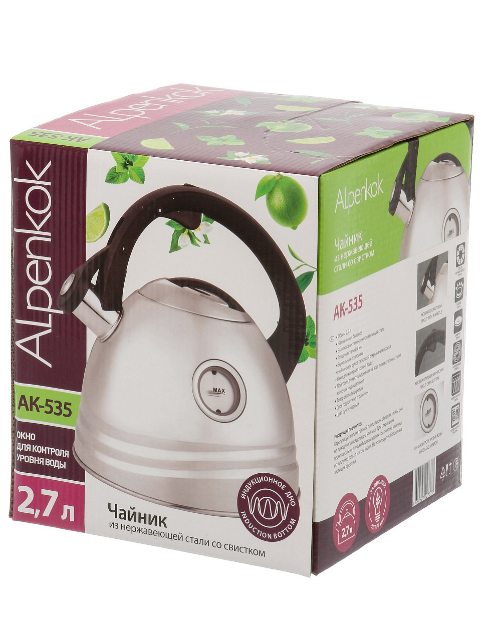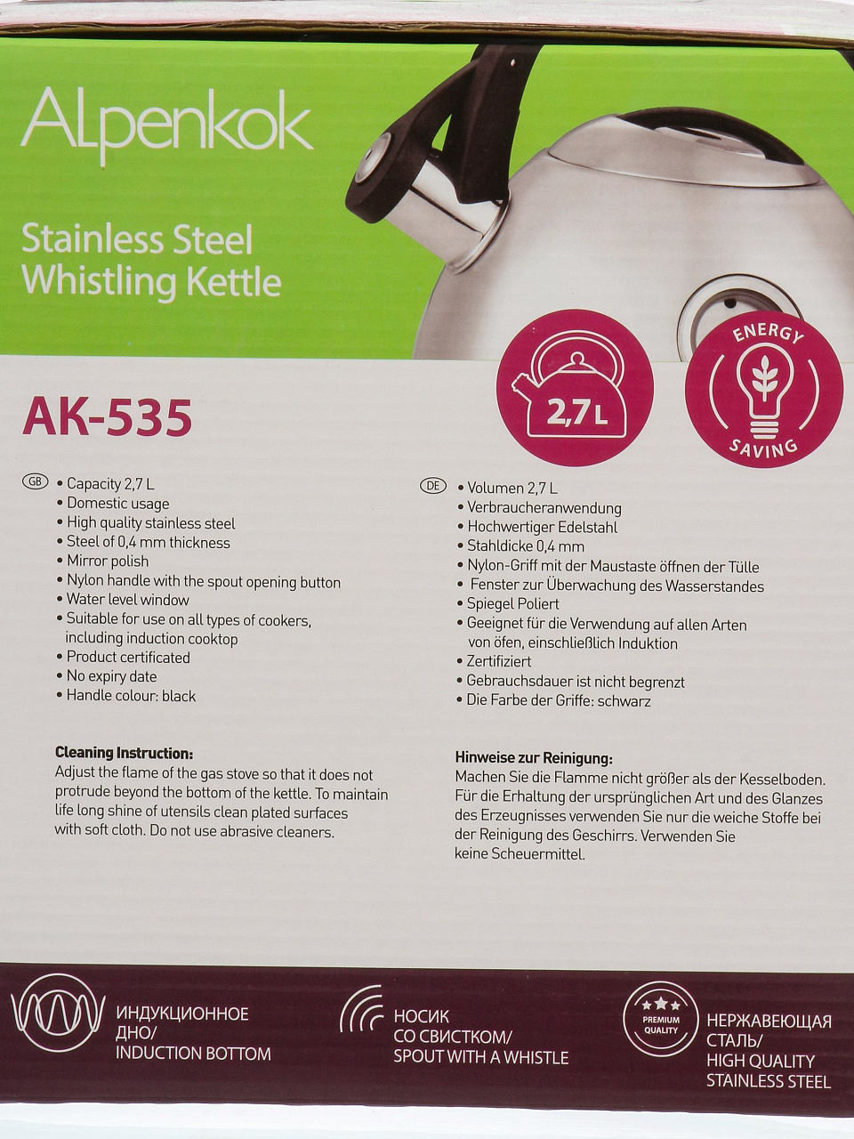 Чайник из нержавеющей стали 2.7 л Alpenkok AK-535: безопасный свисток, зеркальный блеск, подходит для индукции и всех типов плит — удобно для дома и дачи.