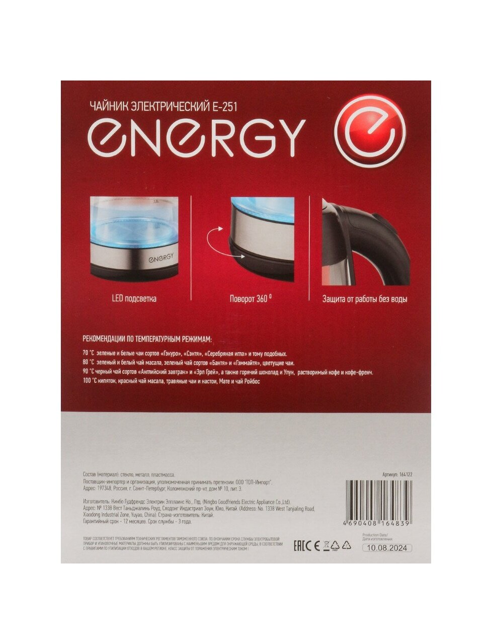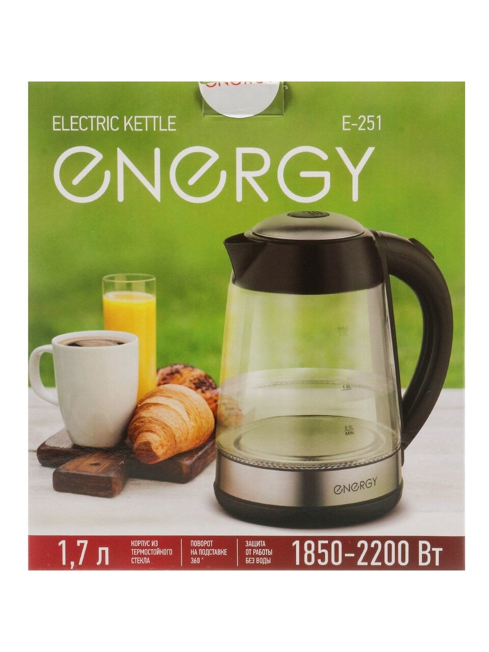 Чайник электрический Energy E-251 1.7 л — быстрый нагрев, эффектное стекло, автоотключение. Идеальный выбор для дома, дачи и подарка.