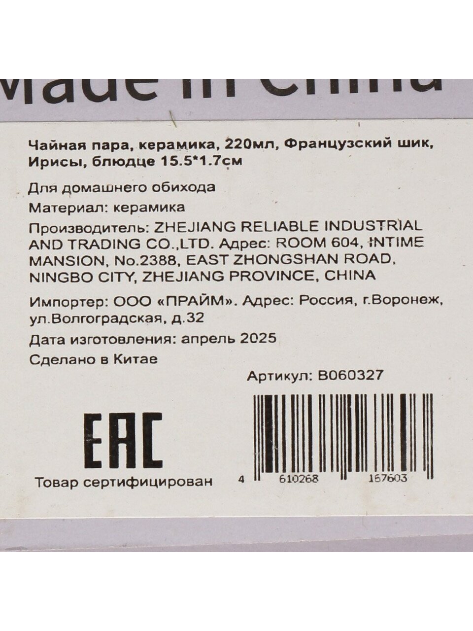 Вы можете приобрести «Чайная пара керамика, 2 предмета, на 1 персону, 220 мл, Французский шик, Ирисы, блюдце 15.5х1.7 см, B060327» и другие товары в нашем интернет-магазине в Казани по низким ценам и с бесплатным самовывозом.