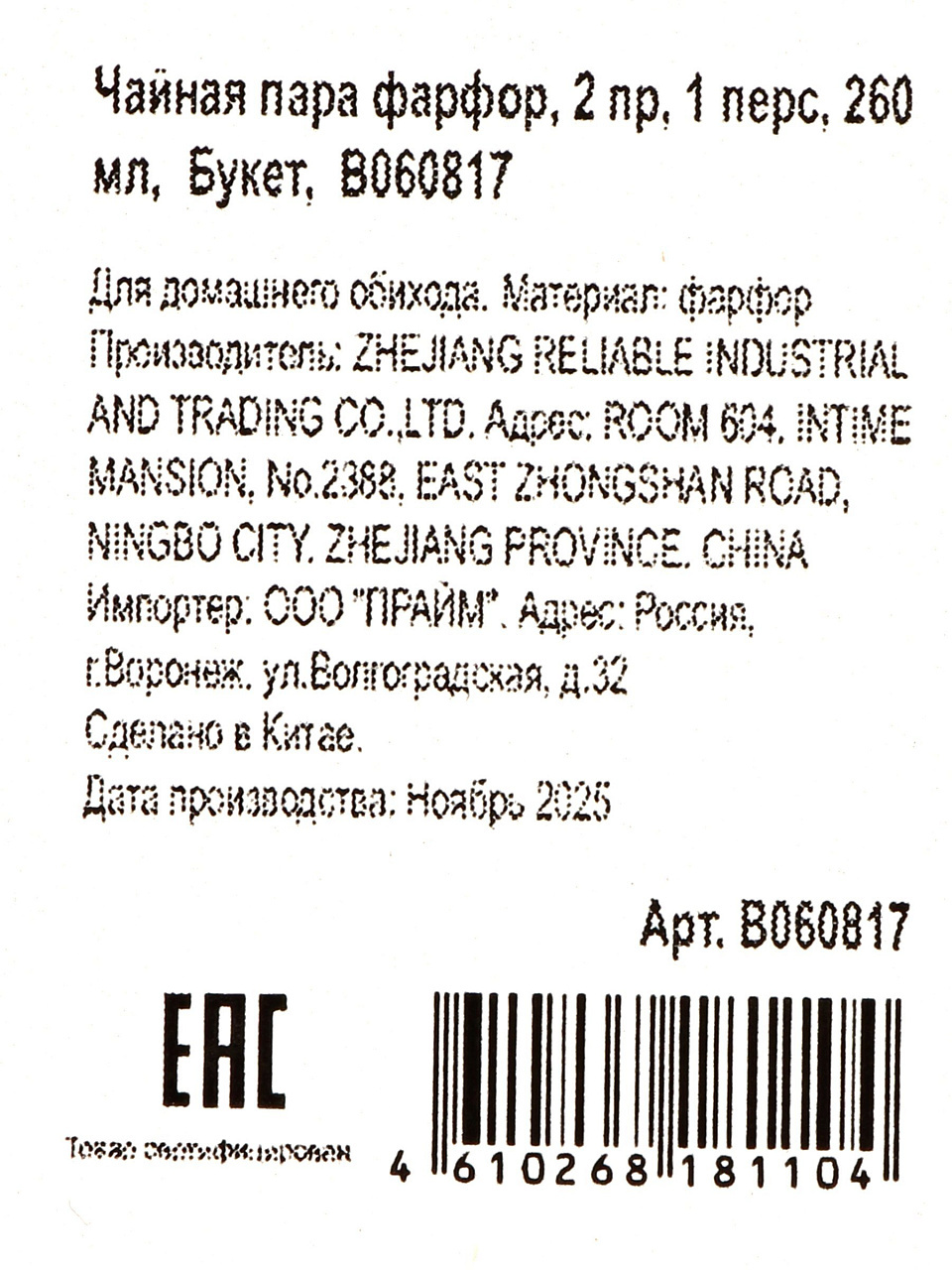 Часто спрашивают: «Как выбрать чайную пару для подарка?» или «Чем отличается фарфоровая пара от керамической?» Фарфор легче и прочнее, лучше сохраняет вкус напитков, а подарочная упаковка позволяет дарить набор без лишней подготовки. Для каких случаев подходит? Универсальное назначение: сервировка стола, подарок маме, бабушке, сестре или подруге на любой праздник. В отличие от аналогов из керамики, фарфор не впитывает запахи и служит дольше при аккуратном уходе.