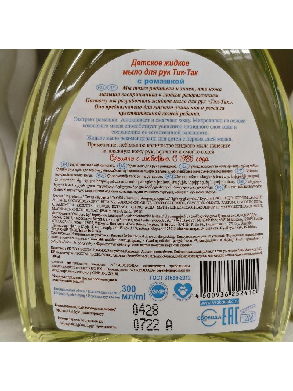 Детское жидкое мыло "Тик-Так" с экстрактом ромашки успокаивает и смягчает кожу. Микролипид на основе кокосового масла способствует усилению липидного слоя кожи и сохранению ее естественной влажности.