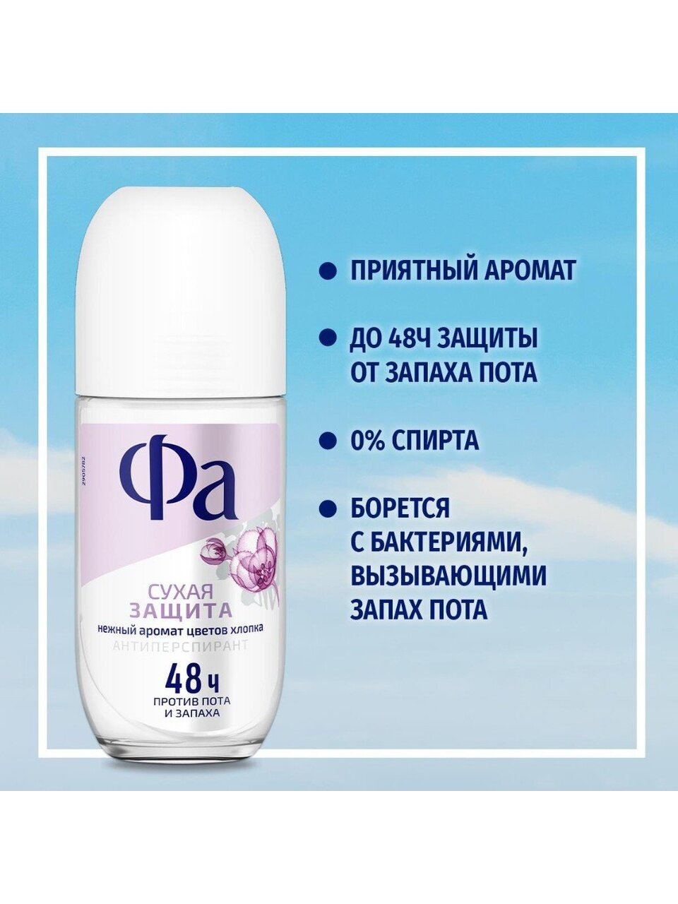 Дезодорант Фа, Сухая защита, для женщин — надежное решение для уверенности и свежести каждый день. Удобный роликовый формат обеспечивает легкое нанесение и быстрое впитывание, не оставляя следов на одежде. Объем 50 мл идеально подходит для использования дома и в поездках.