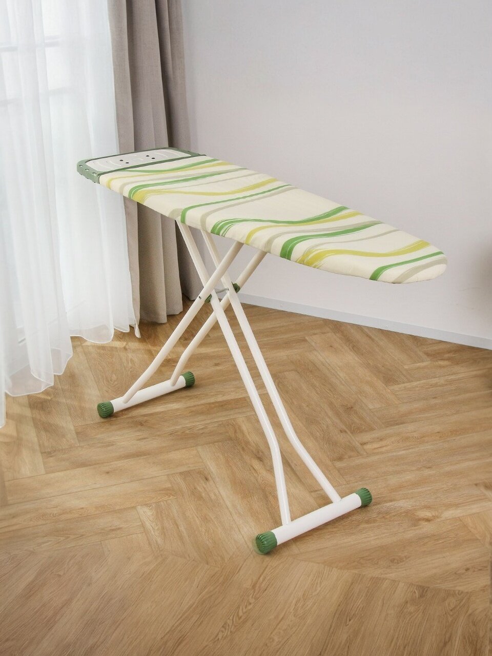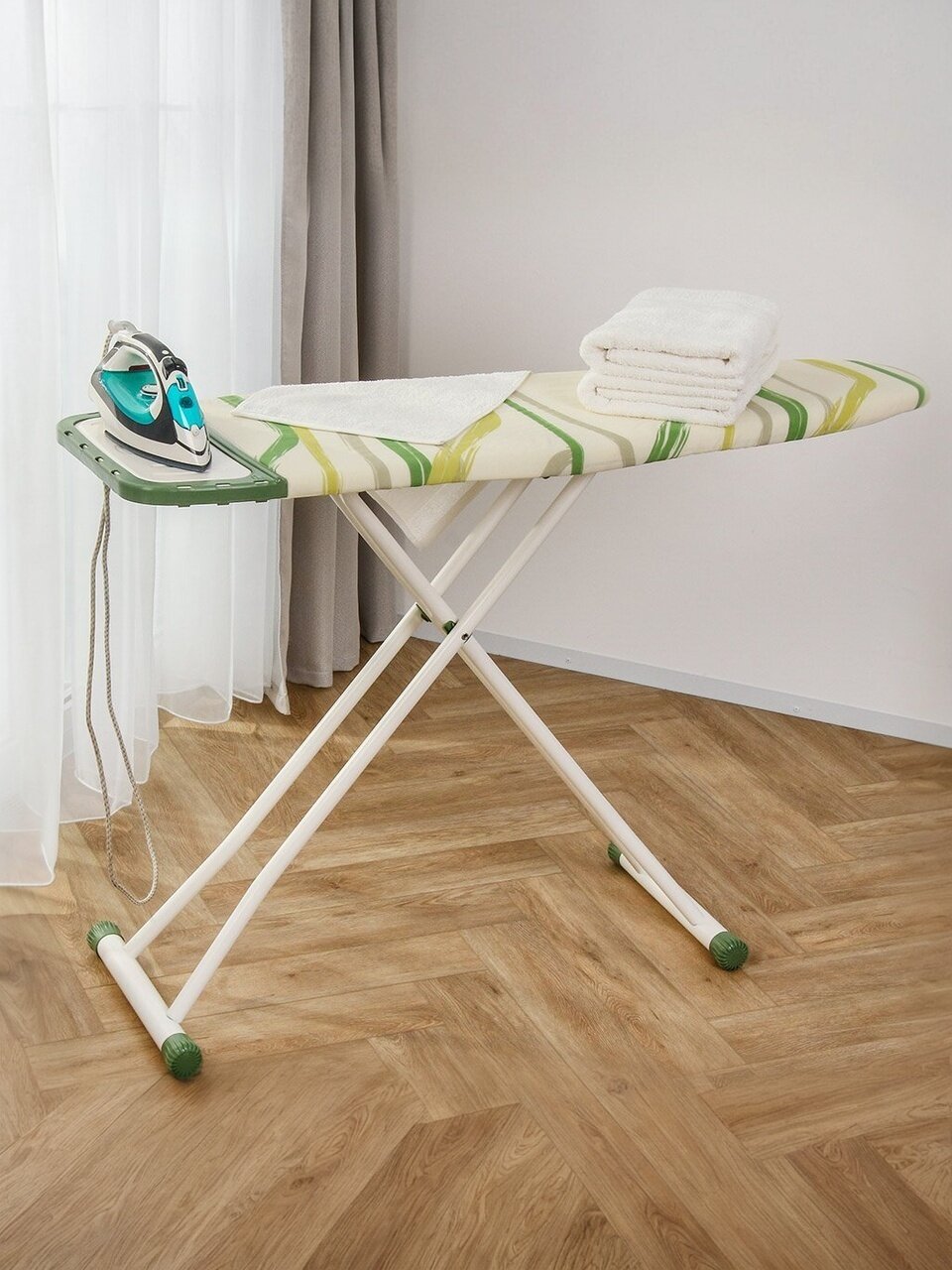 - Уникальное сочетание: длинная рабочая поверхность 130 см и подставка для утюга — удобно для глажки любых вещей;