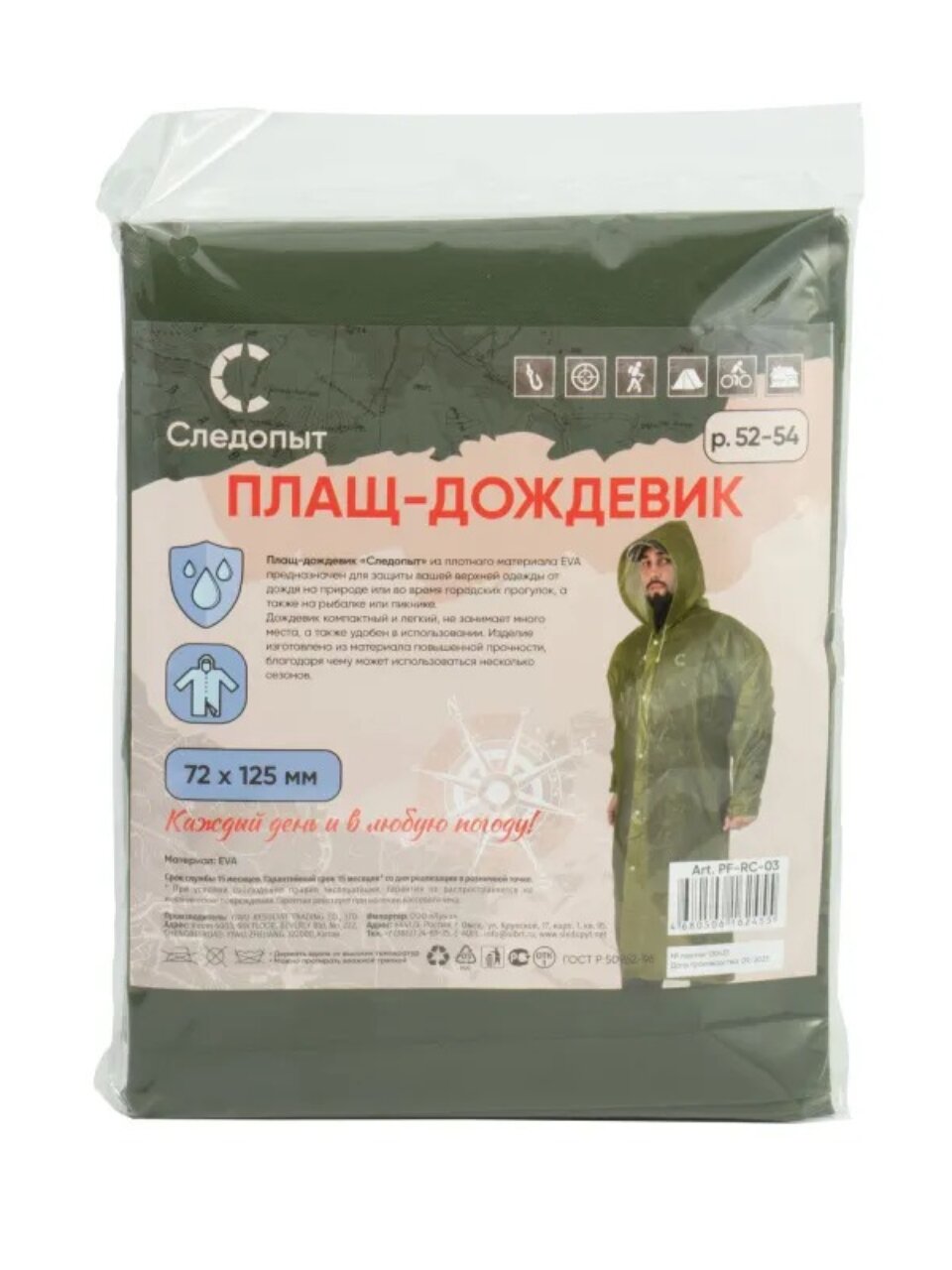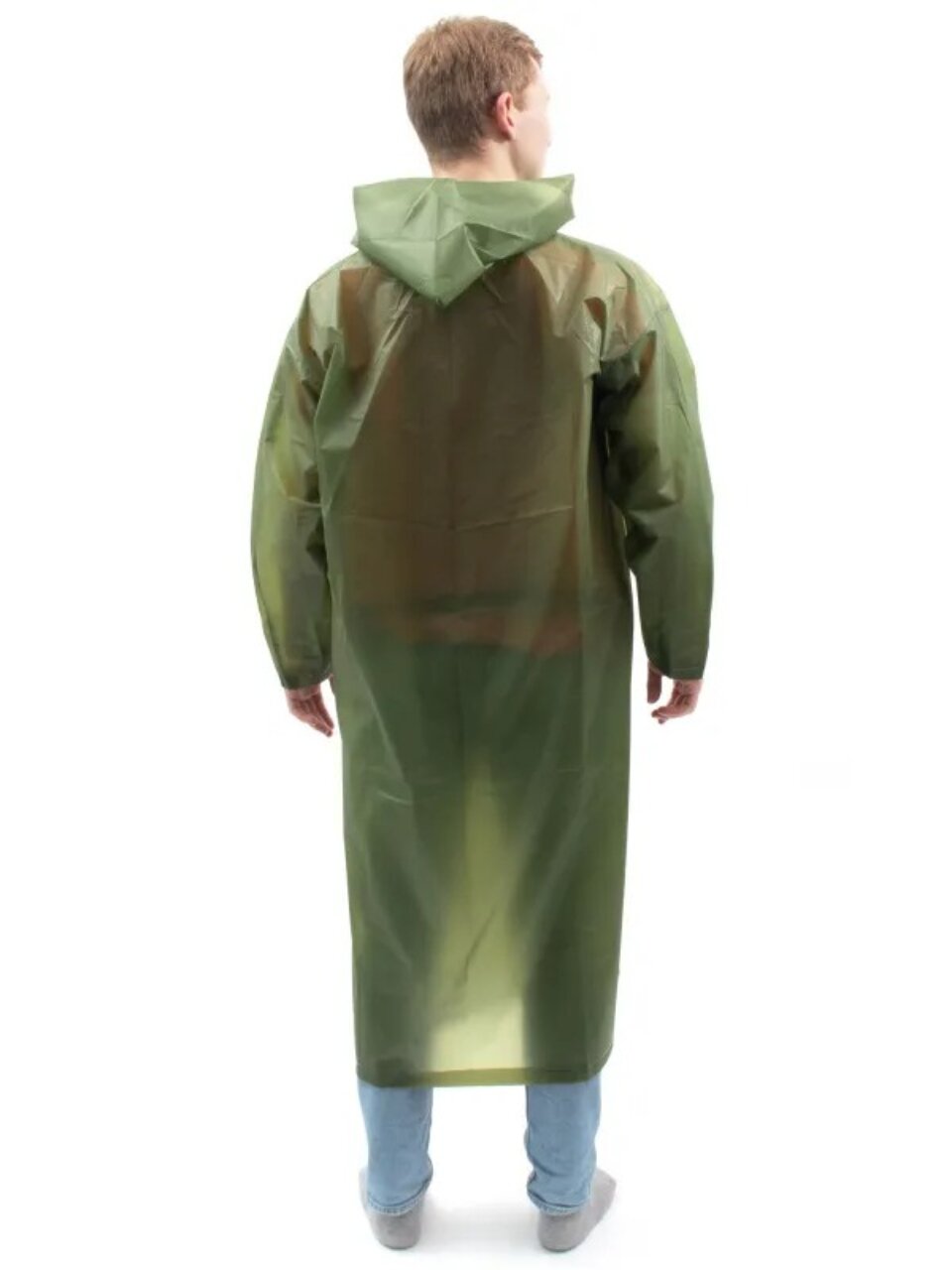 Дождевик размером 68х120 см рассчитан на параметры одежды 48-50, подходит для мужчин и женщин среднего роста и комплекции. Материал ЭВА эластичен, можно надеть поверх куртки.
