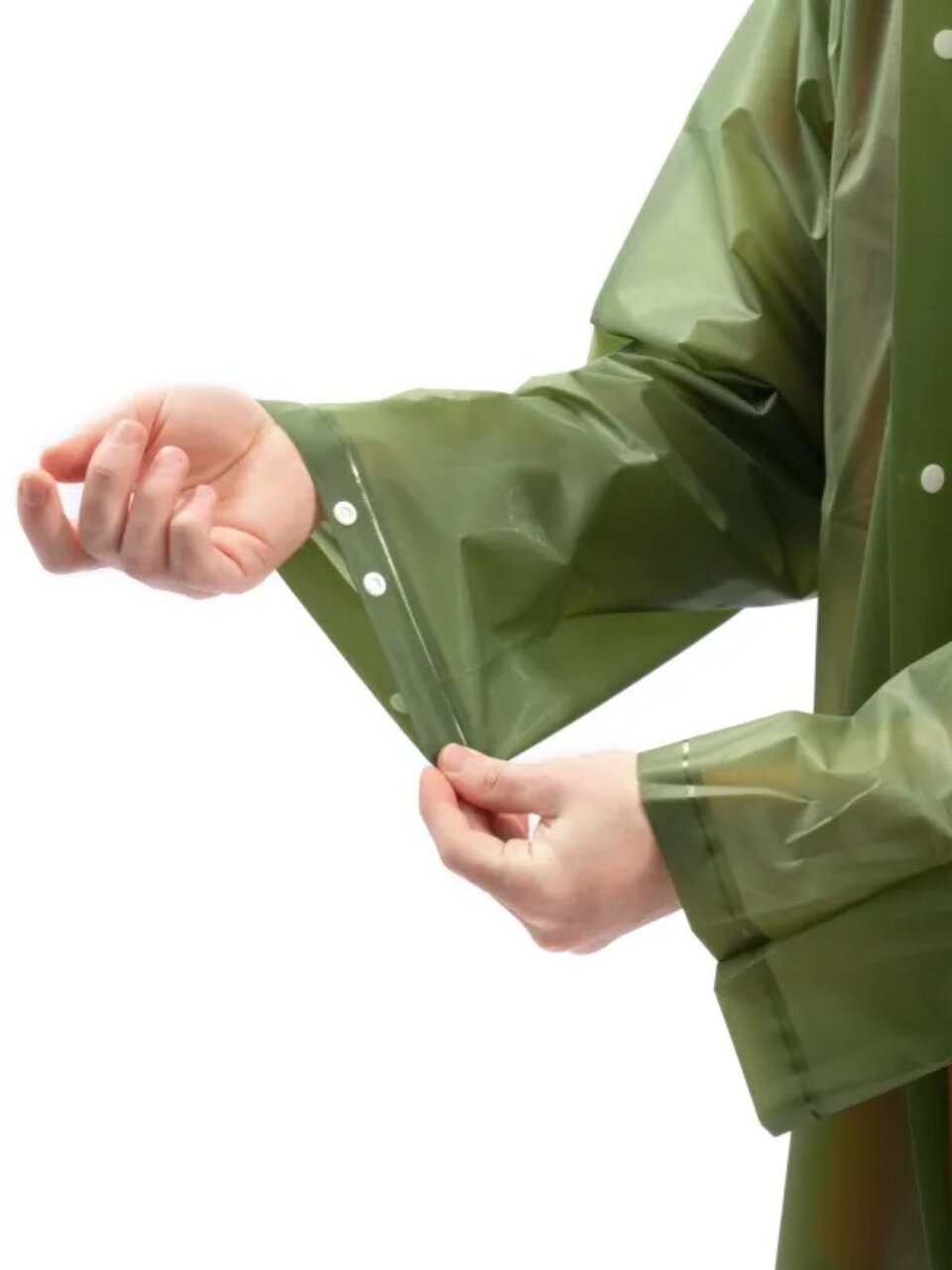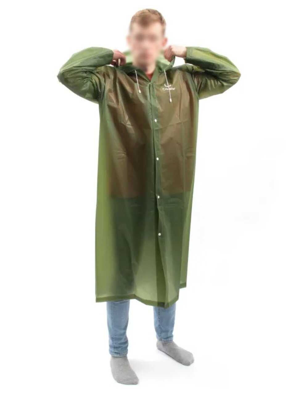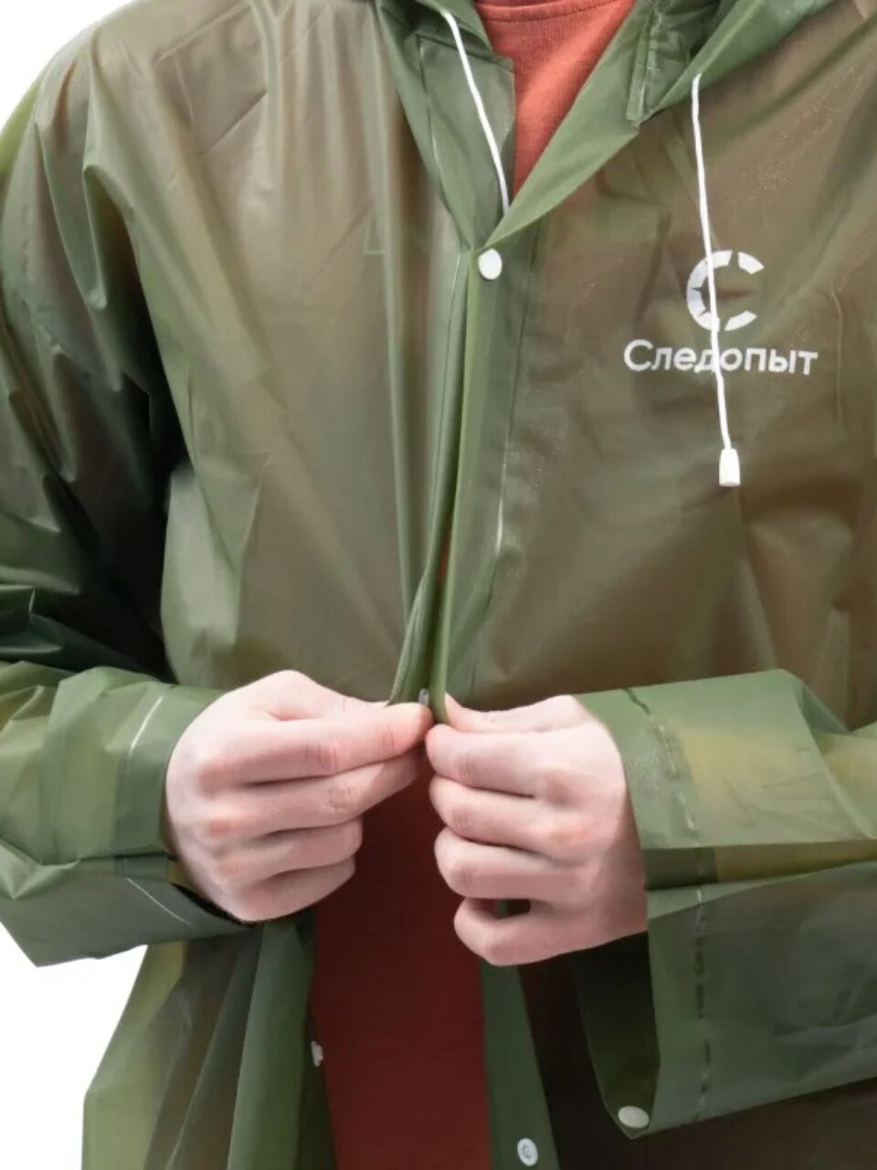 Дождевик изготовлен из ЭВА (экологичный полимер), застёгивается на кнопки, оснащён капюшоном для дополнительной защиты от дождя и ветра.