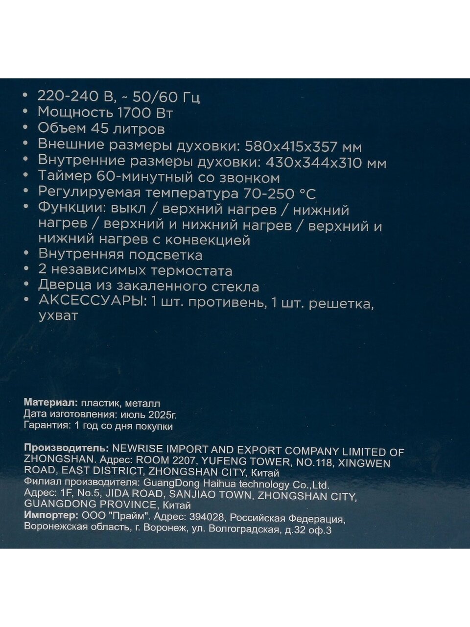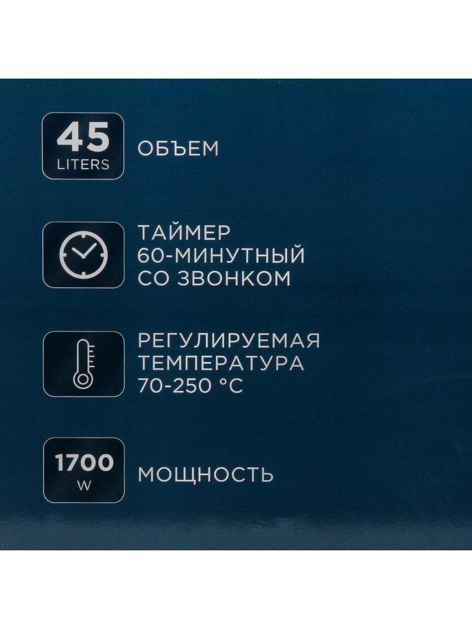 Закажите электрическую духовку RION 45 л — оптимальный выбор по цене и функциональности. Быстрая доставка и официальная гарантия — готовьте с удовольствием и уверенностью в результате!