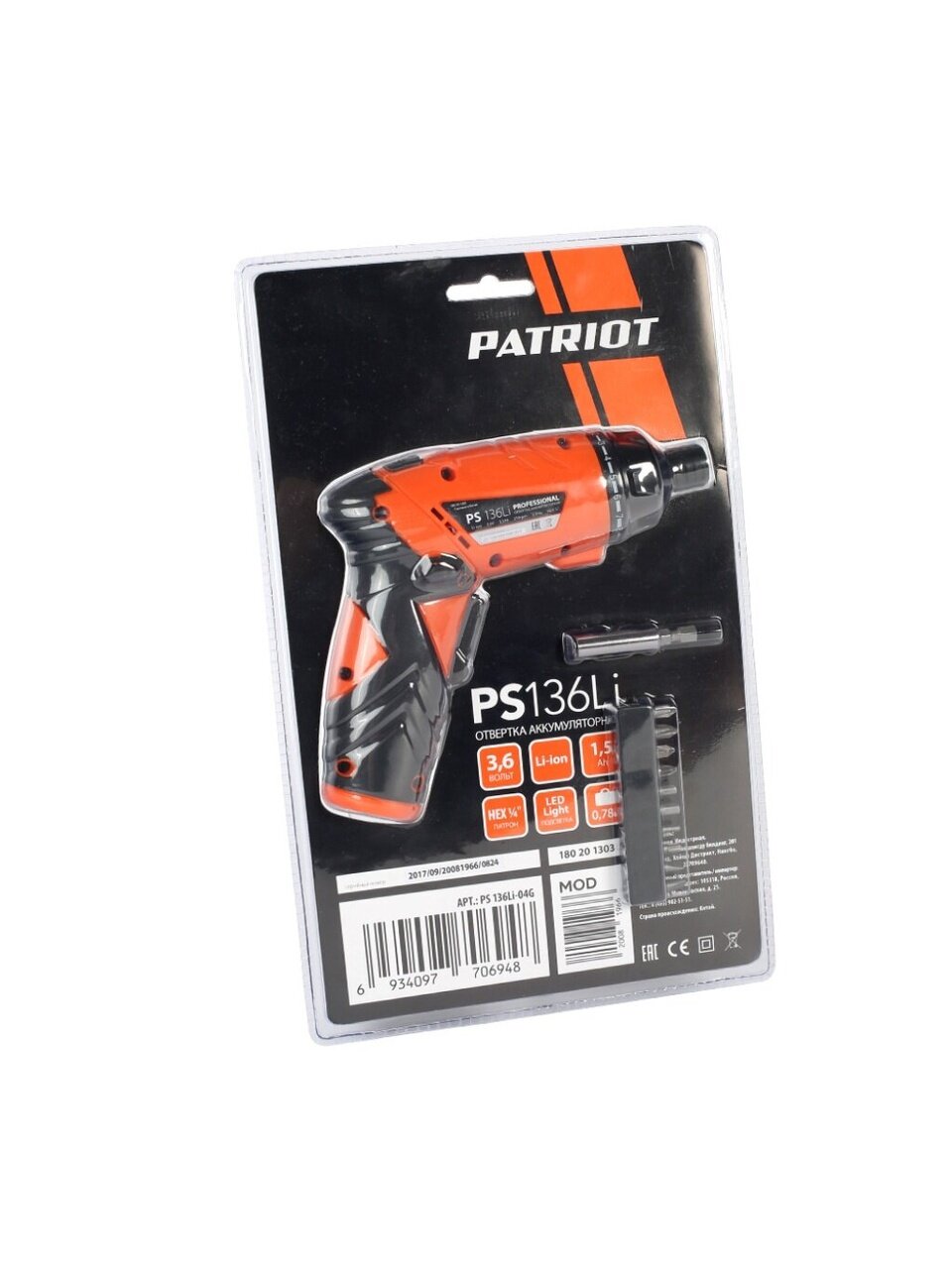 Вы можете приобрести «Отвертка аккумуляторная, Patriot, PS 136, 3.6 В, 1.5 А.ч, Li-ion, 3.5 Н-м, 210 об/мин, 1 скорость, блистер» и другие товары в нашем интернет-магазине в Ельце по низким ценам и с бесплатным самовывозом.