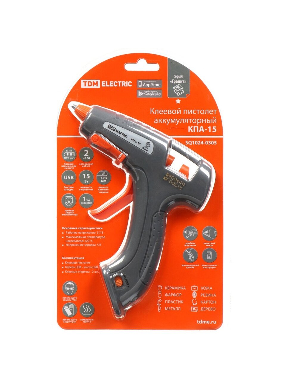 Вы можете приобрести «Электропистолет клеевой 7 мм, 15 Вт, 10 г/мин, 3,7 В 2,9 А*ч Li-Ion, USB, TDM Electric, КПА-15 Гранит, SQ1024-0305» и другие товары в нашем интернет-магазине в Ярославле по низким ценам и с бесплатным самовывозом.