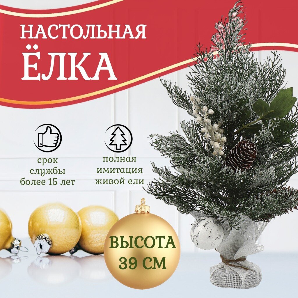 Эта настольная елка высотой 39 см — отличный выбор для тех, кто ищет компактное и стильное новогоднее украшение с заснеженным эффектом. Благодаря веткам из полиэтилена елка выглядит максимально натурально, а дополнительный декор в виде ягод, инея и шишек усиливает ощущение настоящего зимнего леса. Если вы ищете, какую елку выбрать для небольшого помещения или рабочего стола — этот вариант оптимален по размеру и не требует сборки.