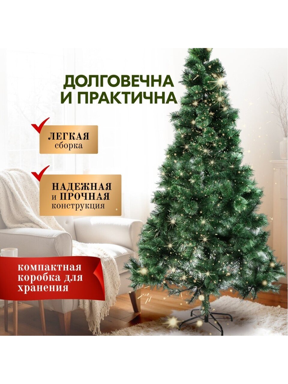 Высота ёлки — 180 см, подставка выполнена из металла, обеспечивает устойчивость, легко собирается и выдерживает вес новогодних украшений.