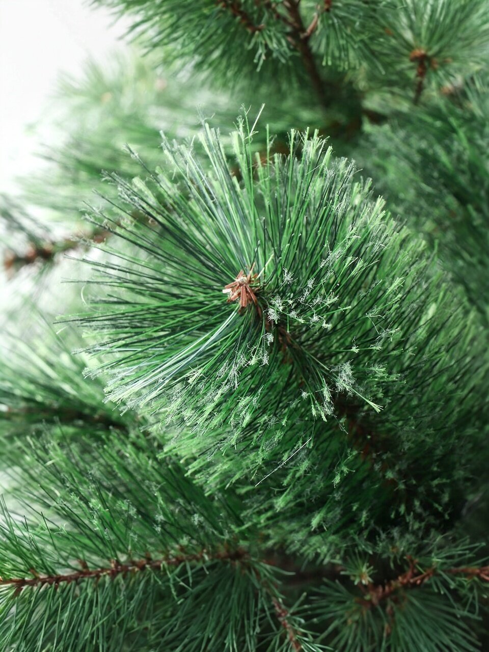 Хвоя выполнена из лески — этот материал плотнее пластика, дольше сохраняет форму, не осыпается и выглядит натурально даже после нескольких сезонов использования.