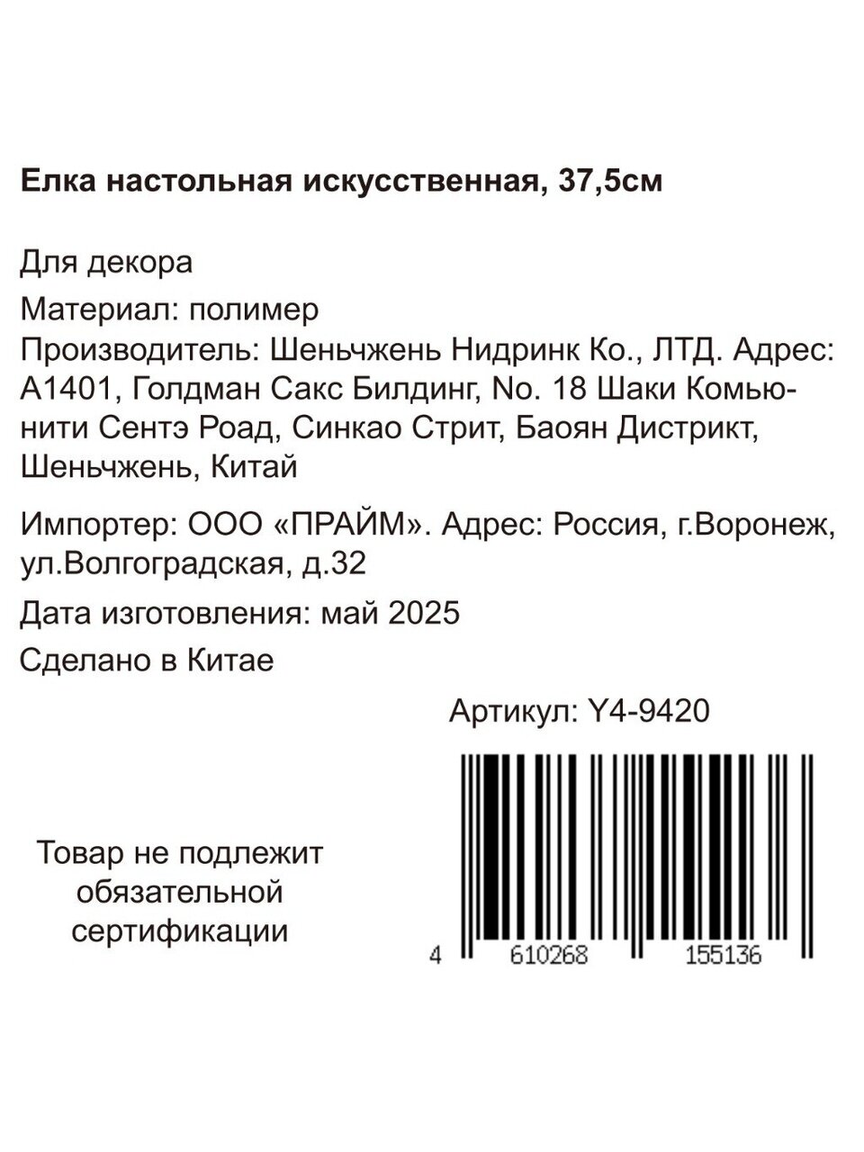 Высота — 37,5 см, диаметр основания — компактный. Елка устойчива, не занимает много места, идеально подходит для небольших столов, полок и подоконников.
