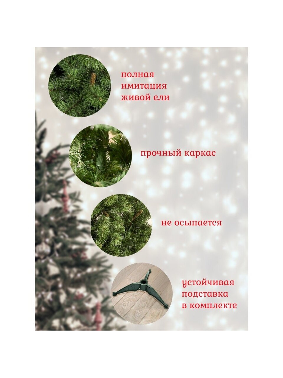 Как использовать елку? Просто соберите детали по инструкции, расправьте ветви — и украшайте гирляндами или игрушками. Елка не требует дополнительного ухода, не впитывает запахи, подходит для многократного использования. Для тех, кто ищет, чем отличается эта модель от других, — обратите внимание на классическую форму, насыщенный зеленый цвет и устойчивость подставки.