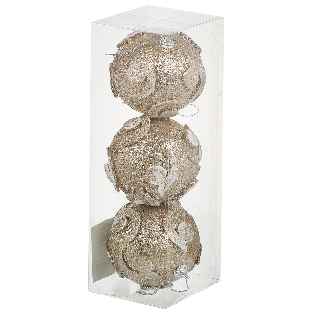 В наборе три шара диаметром 8 см, цвет — шампань (бежевый), дизайн — однотонный, упакованы в коробку.