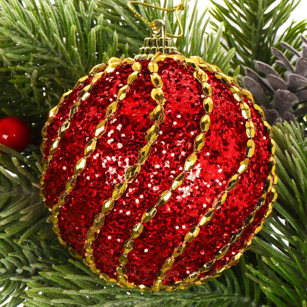 Каждый шар имеет диаметр 8 см, выполнен в насыщенном красном цвете с винтажным рисунком; все украшения идут в коробке, что удобно для хранения и транспортировки.