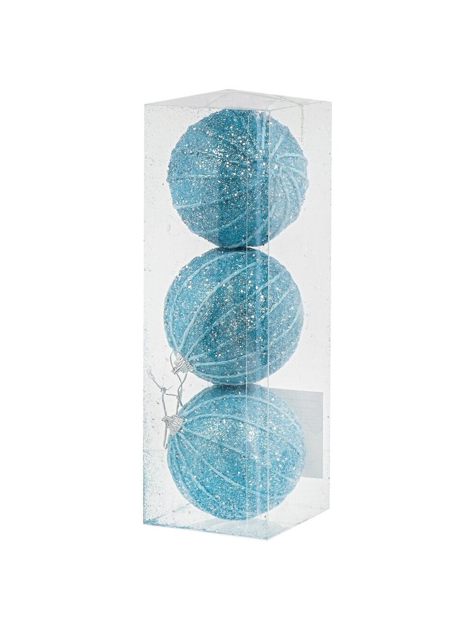 В комплекте 3 шара диаметром 8 см, цвет — голубой. Каждый шар оснащён подвеской для быстрой фиксации на ёлке.