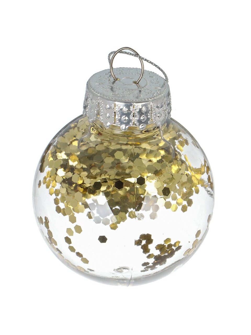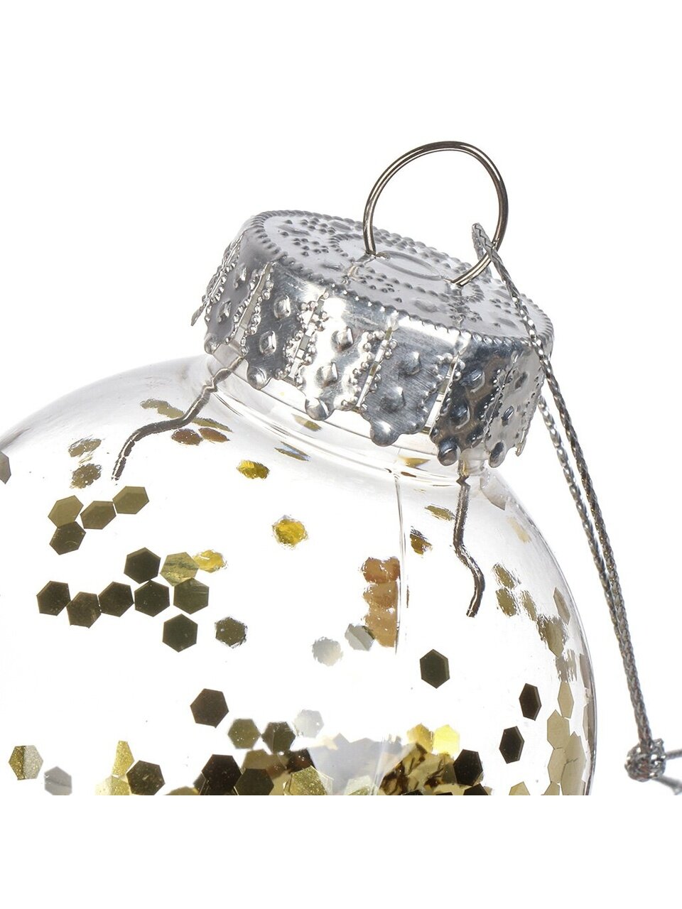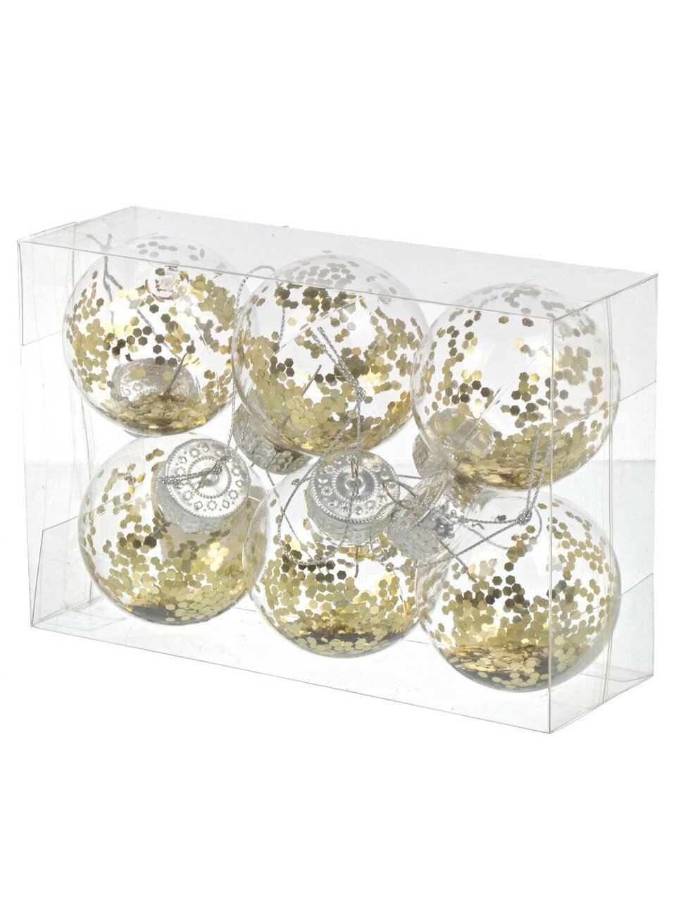 Набор состоит из 6 прозрачных шаров с наполнением и блёстками, каждый — на подвеске, упакованы в коробку, материал — прочный пластик, цвет — золотой.