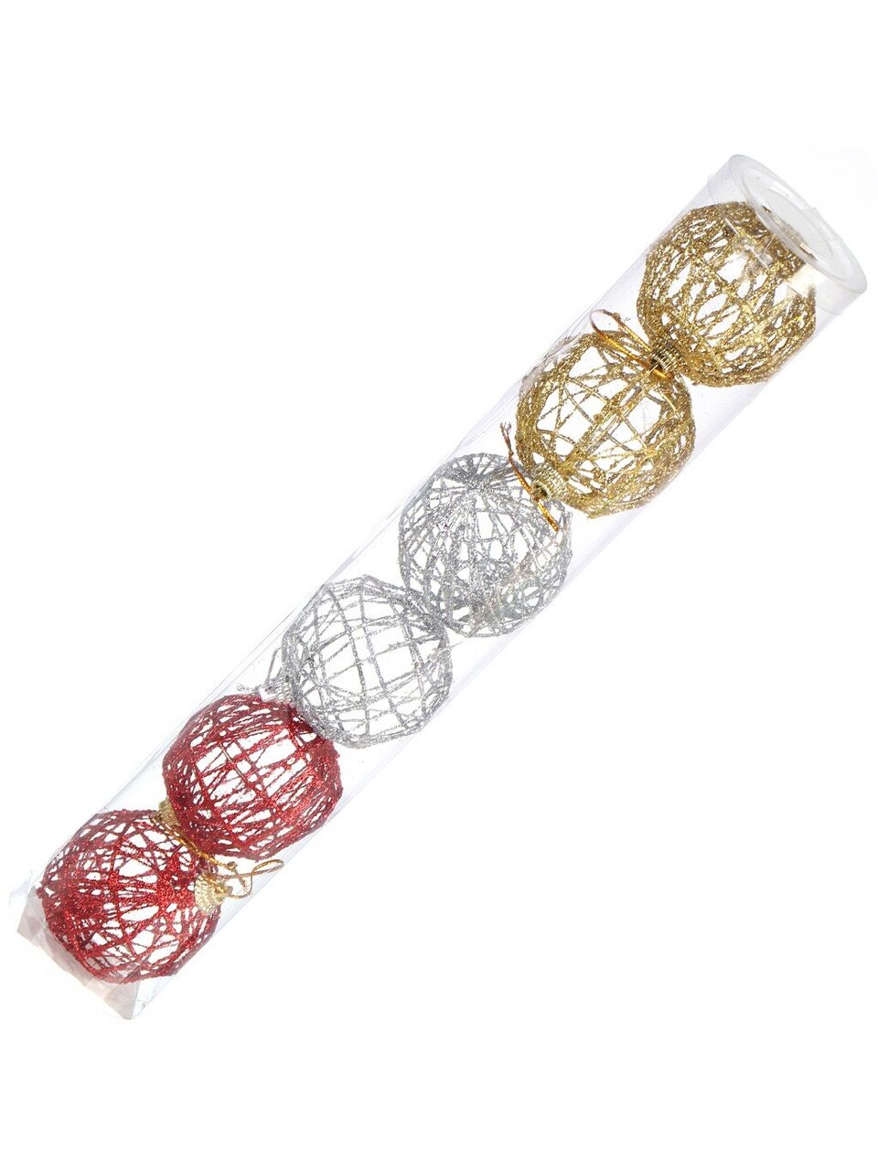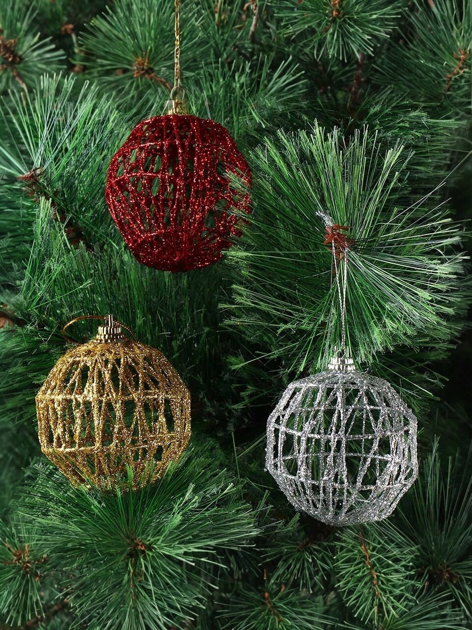 В наборе 6 шаров диаметром 6 см, цвета: золото, серебро, красный, с удобным креплением на подвеске.