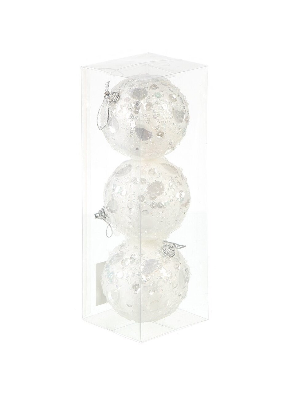 Набор из 3 шаров упакован в коробку, универсальный белый цвет и блёстки делают его актуальным подарком для любого интерьера.