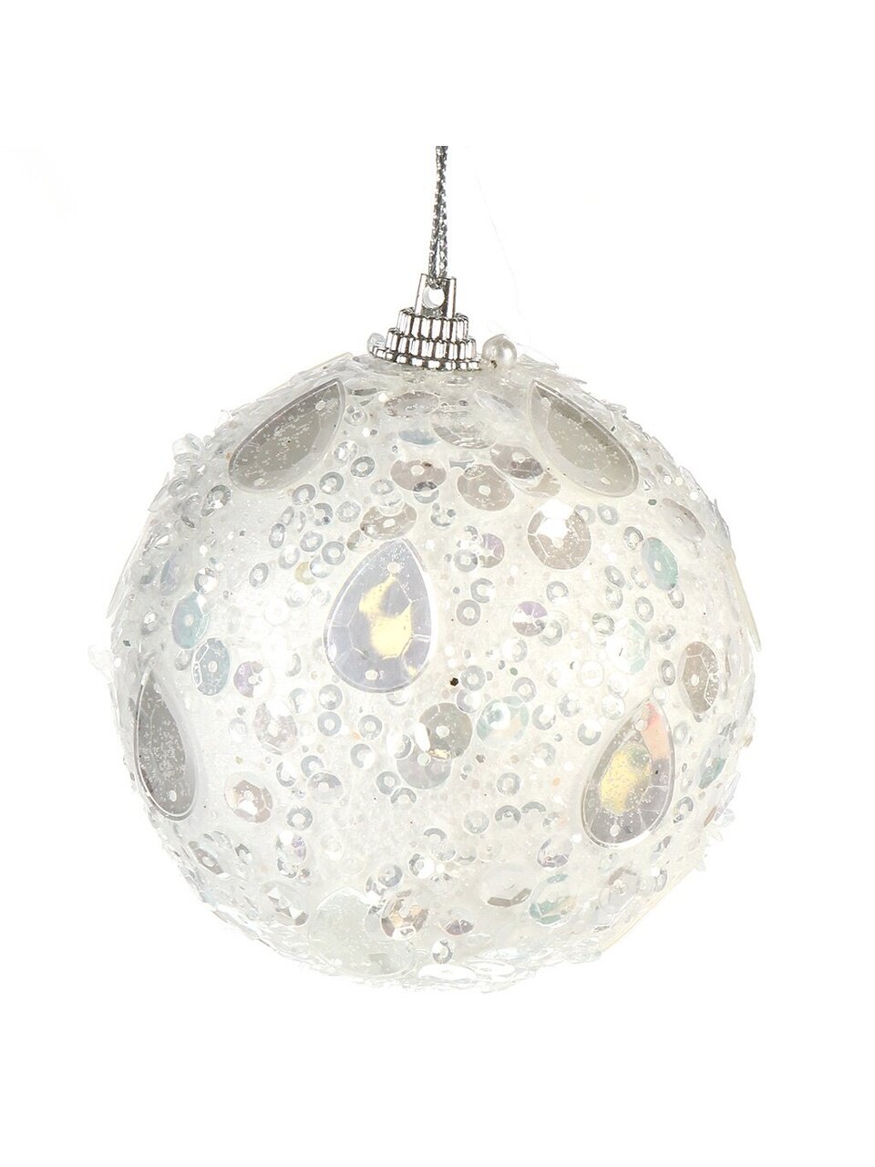 Диаметр каждого шара — 8 см, тип крепления — подвеска, материал — прочный полимер с блёстками и пайетками.