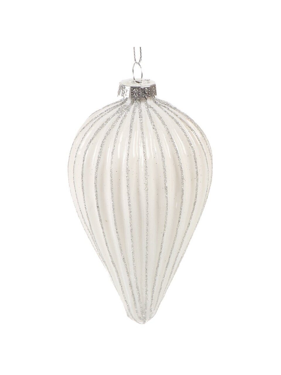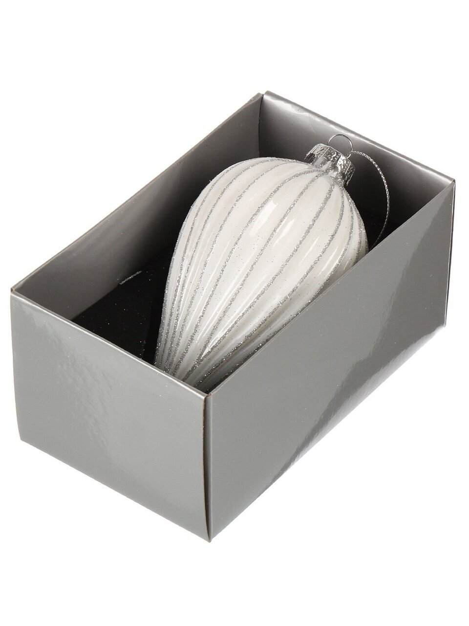 Елочное украшение Капля Серебристые грани — это выбор для тех, кто ищет, какое стеклянное украшение купить для новогодней елки, чтобы добавить интерьеру изысканности и уюта. Благодаря белому цвету и блестящему покрытию игрушка гармонирует с разными стилями: скандинавским, классическим, современным. Размер 7х13 см удобен для размещения как на большой елке, так и на компактных композициях — подвеска надежно фиксируется и не утяжеляет ветки.