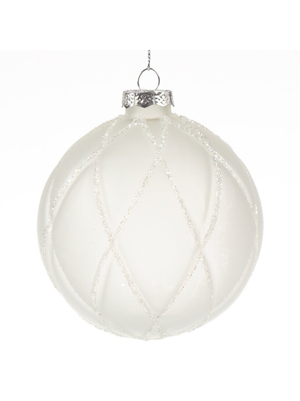 Елочный шар «Белая сеть» из стекла 10 см — стильный акцент для новогоднего декора. Эффект блеска, универсальный белый цвет, безопасная упаковка.