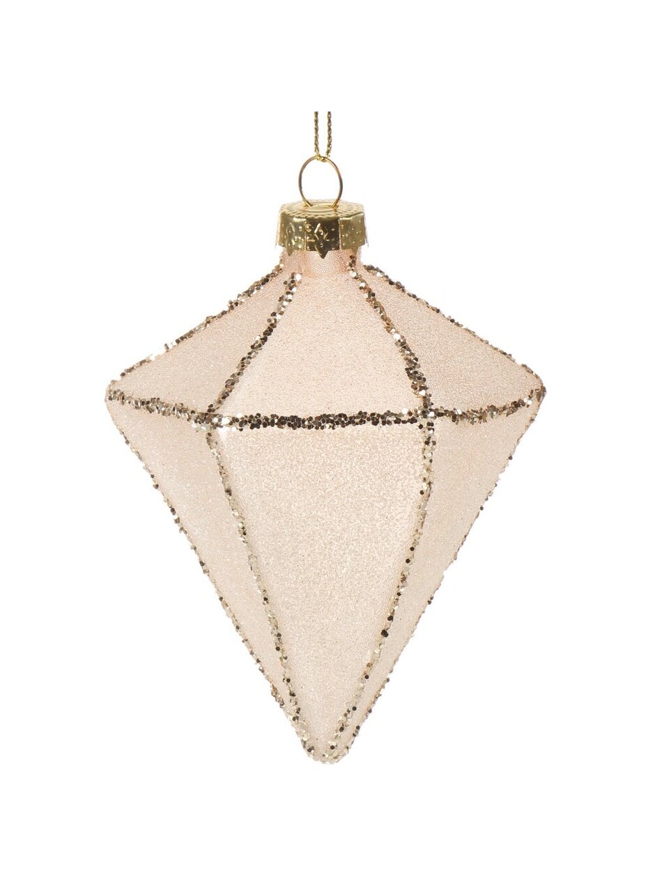 Модель оснащена подвеской, что позволяет легко и безопасно разместить ее на ветках любой елки. Материал — стекло с пудровыми узорами и блестками.