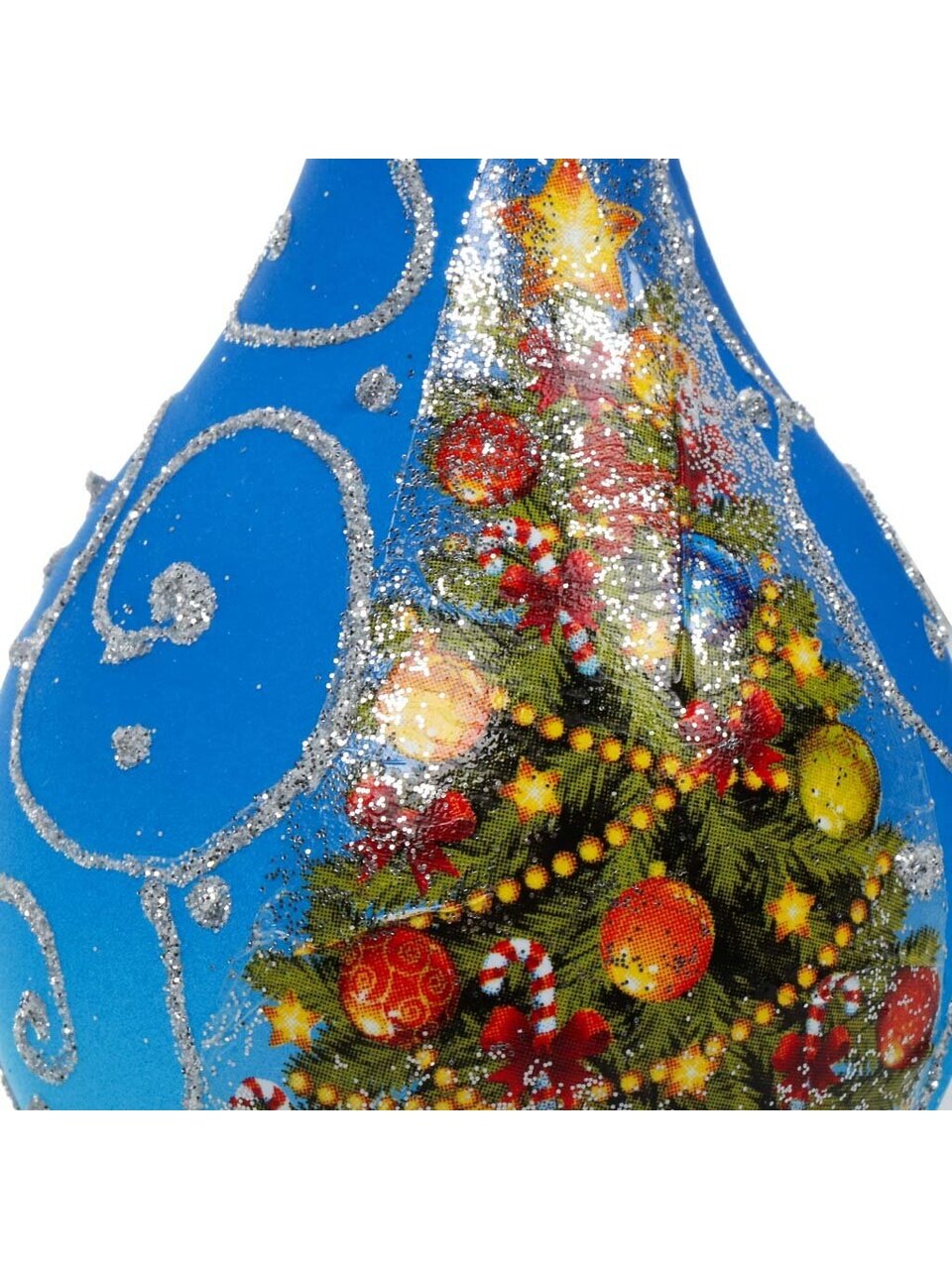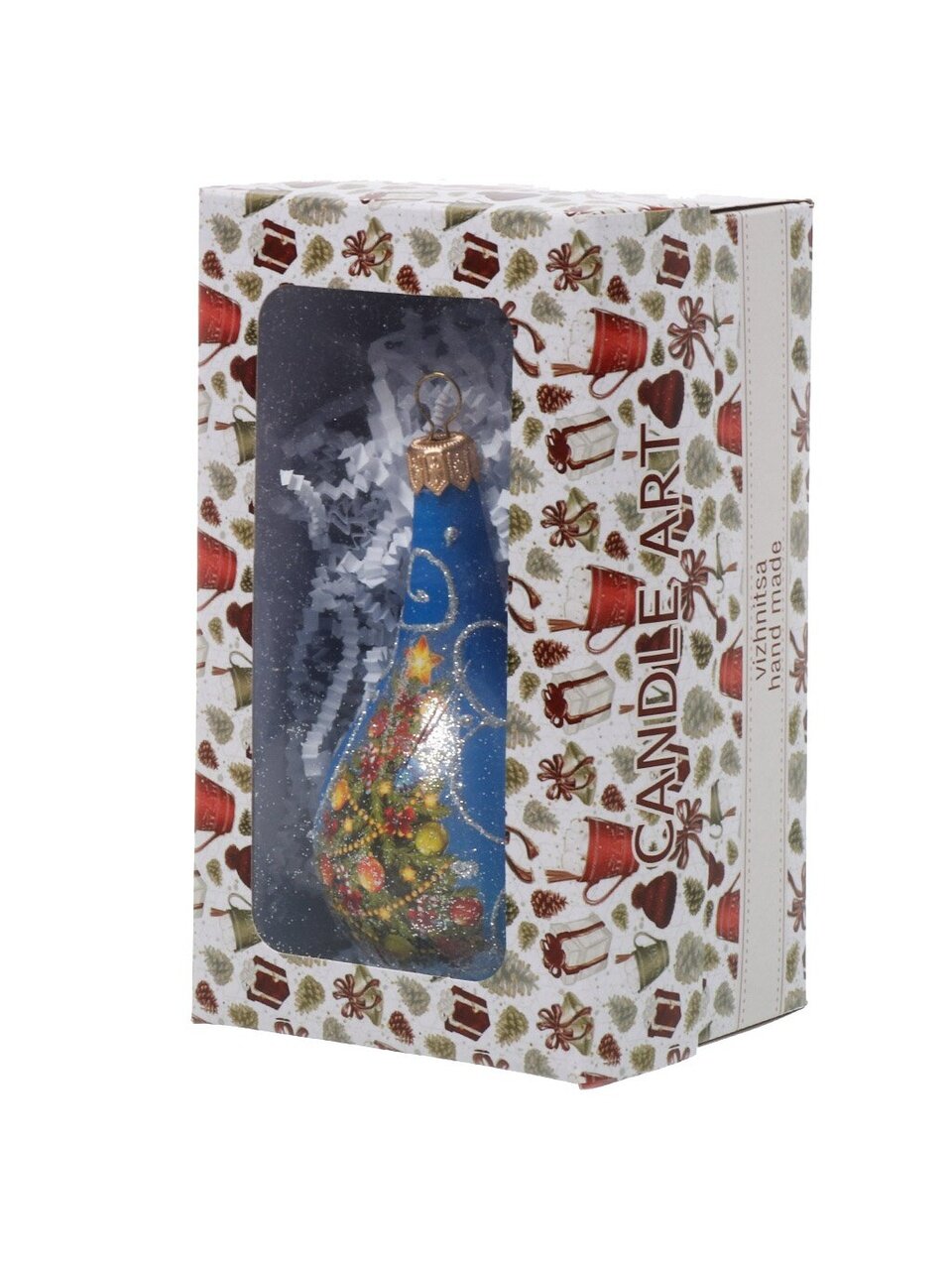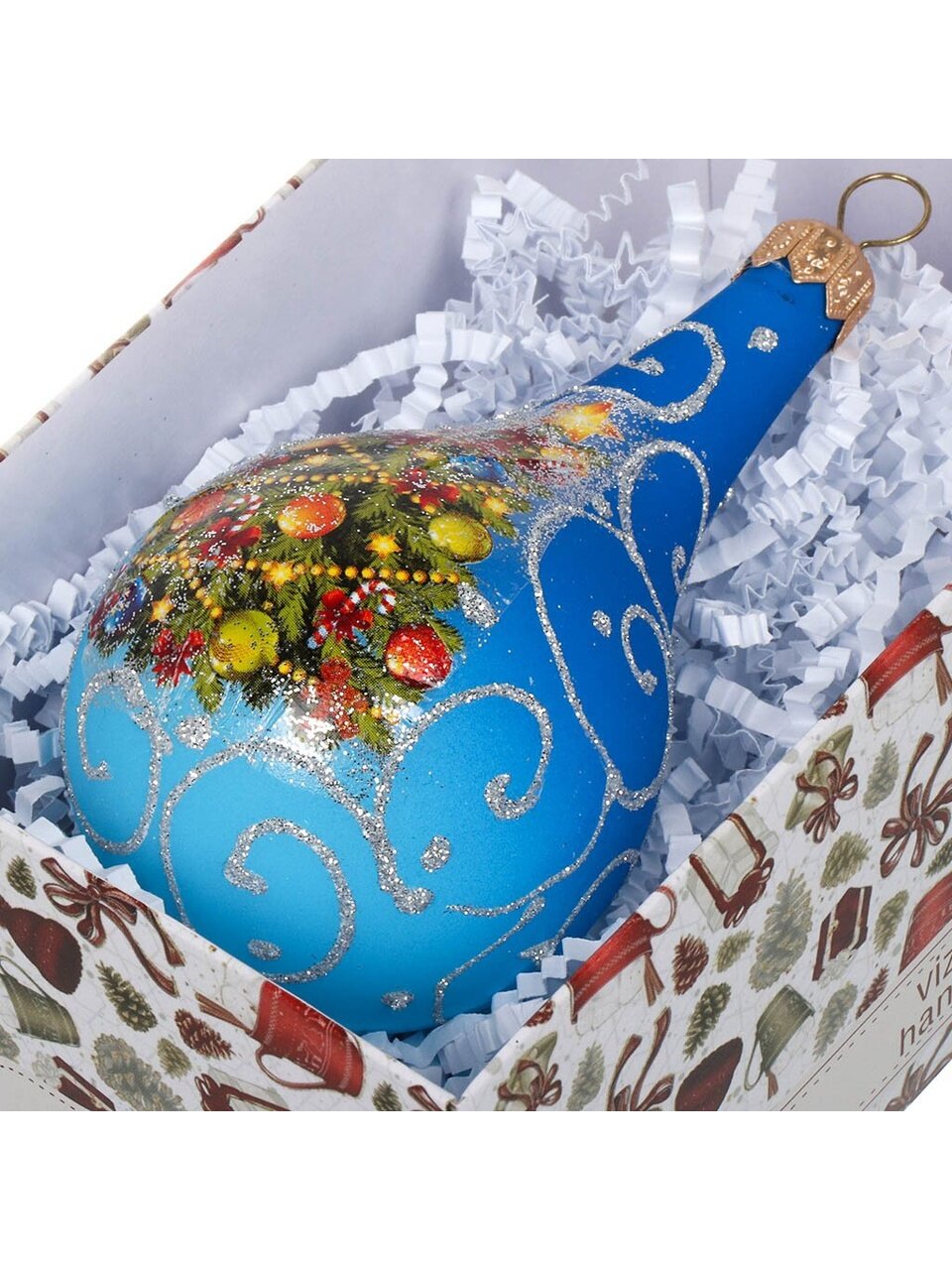 Высота — 13 см, материал — прочное стекло с ручной росписью. Украшение среднего размера, подходит для стандартных и мини-елок.