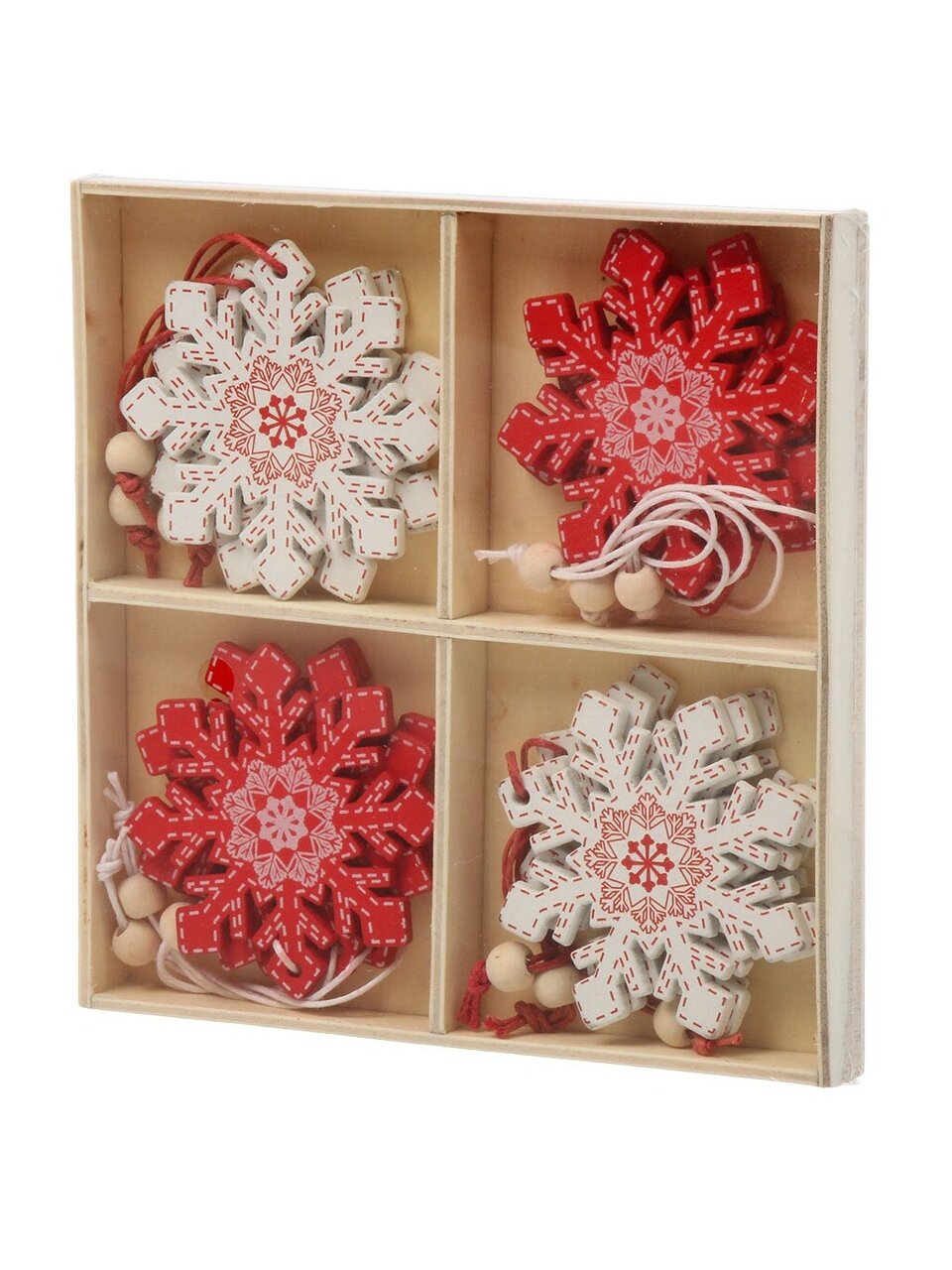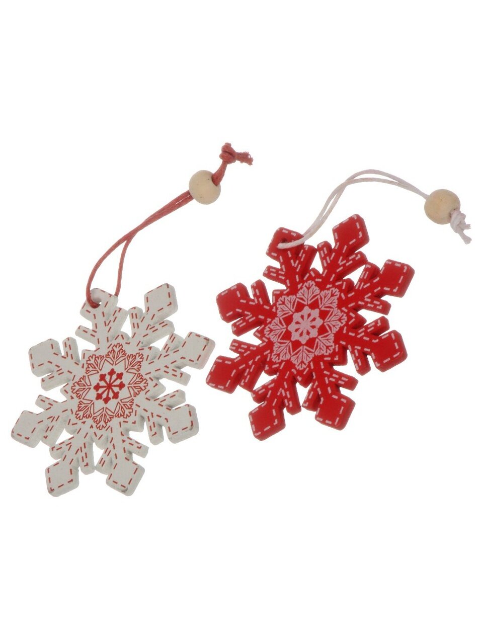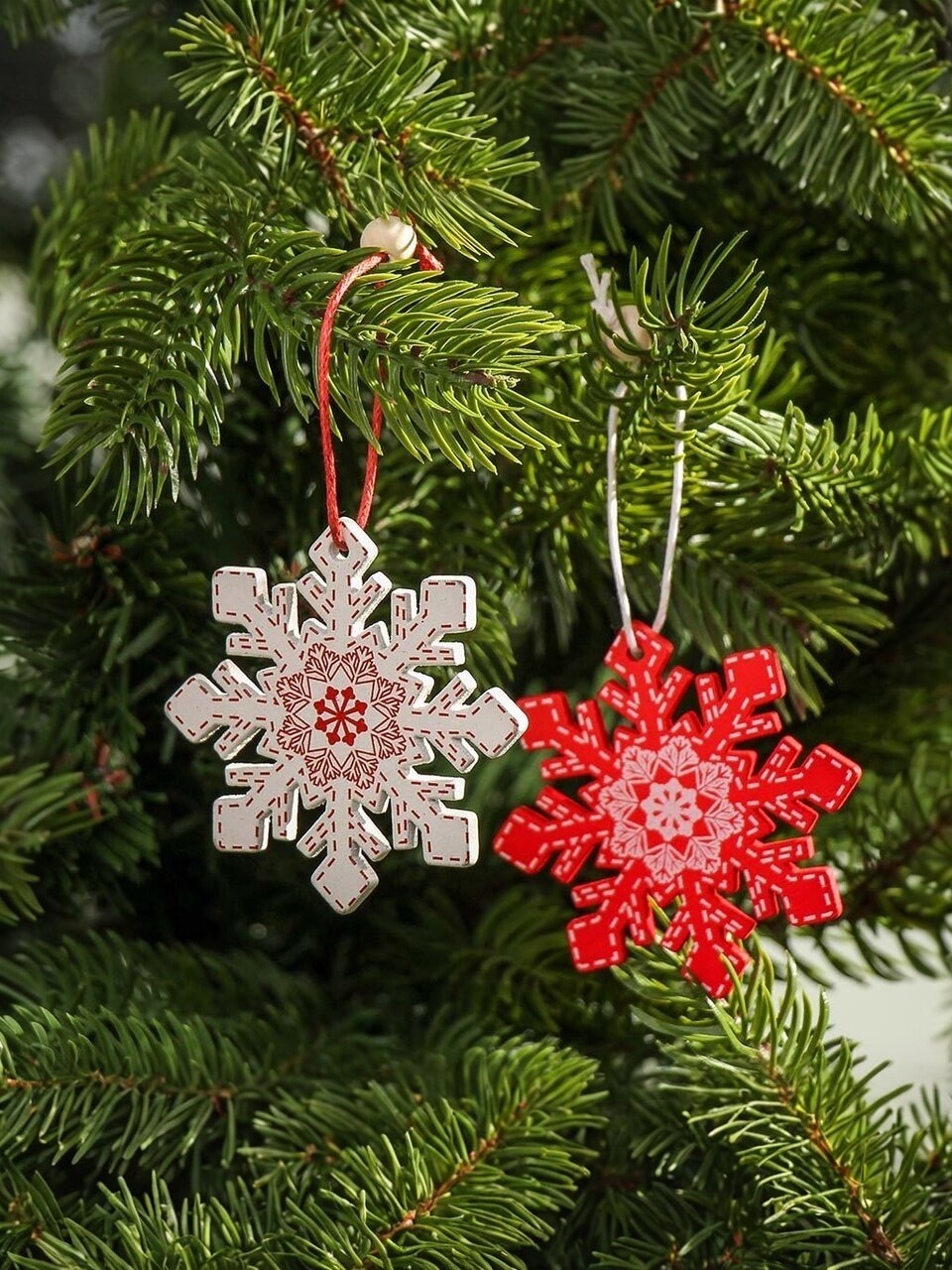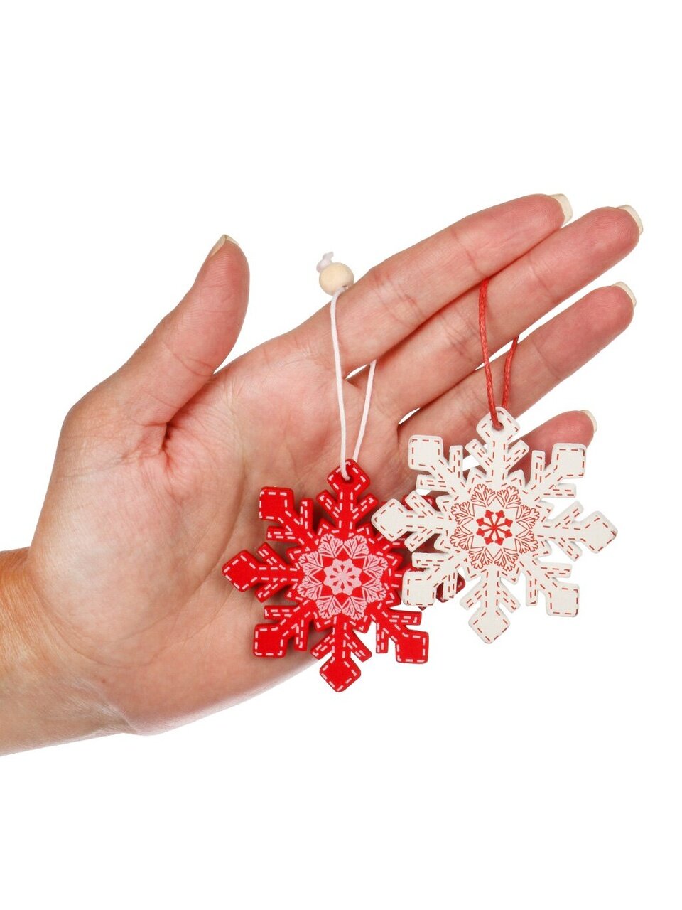 В комплекте 12 деревянных снежинок диаметром 5.5 см, с креплением на подвеске — оптимально для ёлки любого размера.