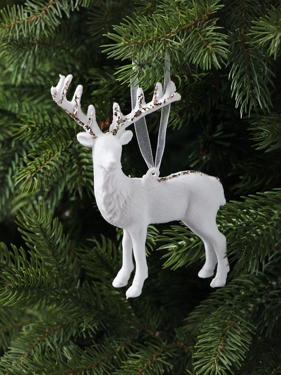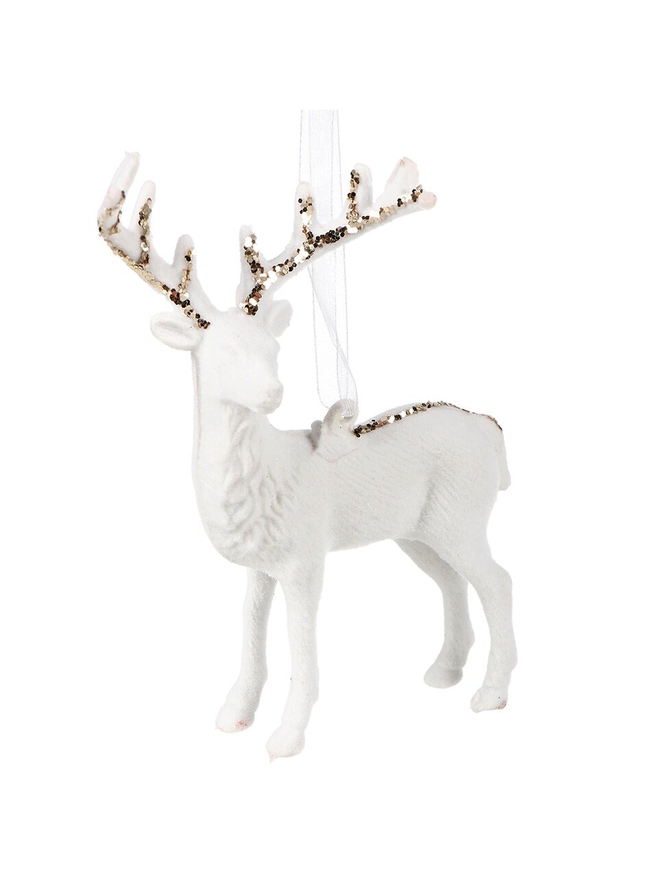 Стильное елочное украшение «Олень» из пластика и флока: белый с золотом, небьющийся, 14 см — для уличной и домашней елки, выгодно купить онлайн.