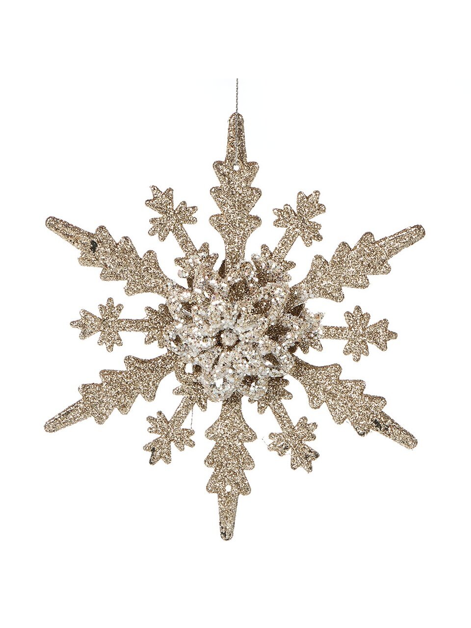 Эффектная снежинка из пластика 16 см цвета шампань: безопасное елочное украшение с блеском для стильного декора дома, дачи или подарка.