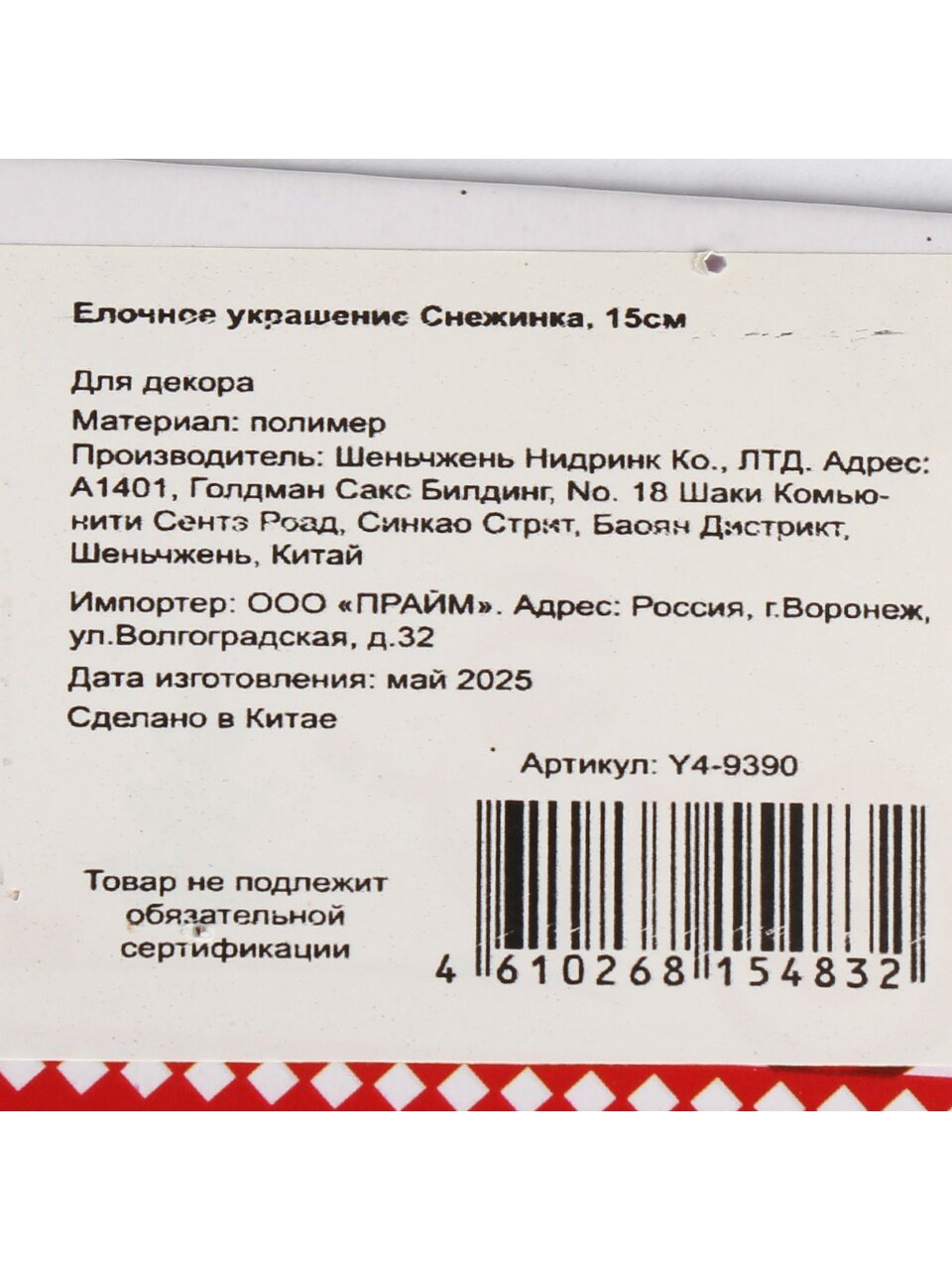 Диаметр украшения — 15 см, материал — пластик с блёстками. Благодаря этому снежинка подходит для уличной ёлки: не боится влаги, не выгорает на солнце, крепится на подвеске.