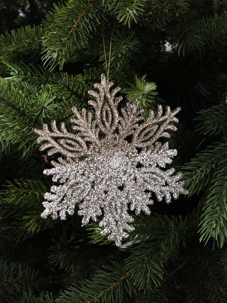 - Безопасная и стильная: пластиковая снежинка с блёстками не разобьётся, поддержит тренд на долговечный декор