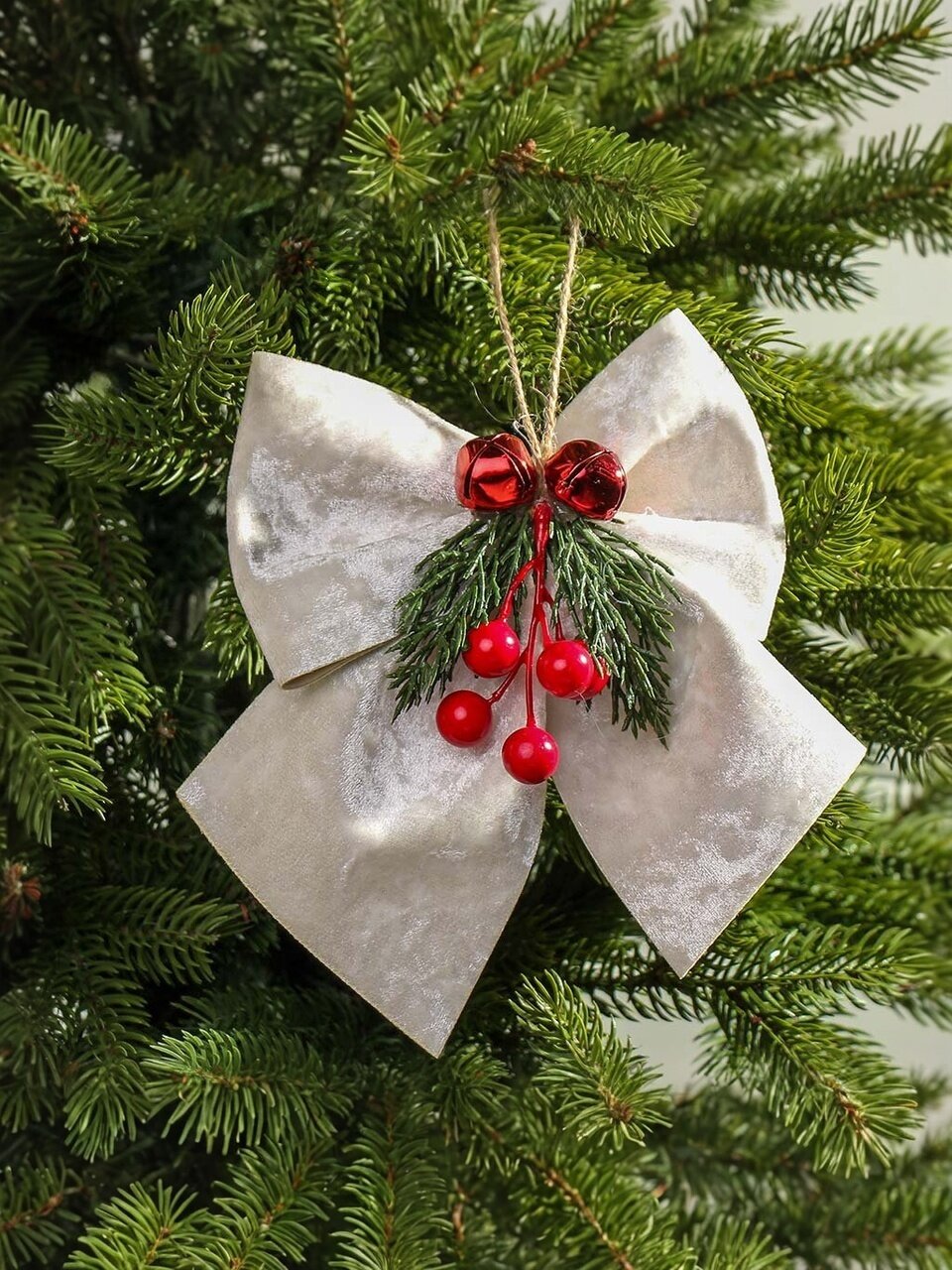 Елочное украшение Бант 16х20 см из белого текстиля — это современное решение для праздничного оформления, которое идеально впишется в любой интерьер. Благодаря большому размеру и подвесному креплению бант легко разместить как на большой уличной ёлке, так и на домашнем дереве, дверях или окнах. Текстильная основа не трескается и не ломается, что особенно важно, если вы ищете, какой декор выбрать для дома с детьми или для украшения дачного участка на морозе.