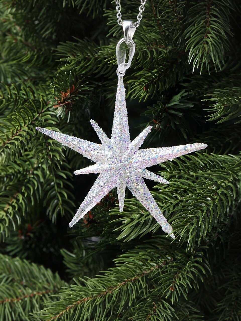 Диаметр снежинки — 11,5 см, высота — 12 см. Крупный размер делает ее заметной даже на больших и уличных елках.